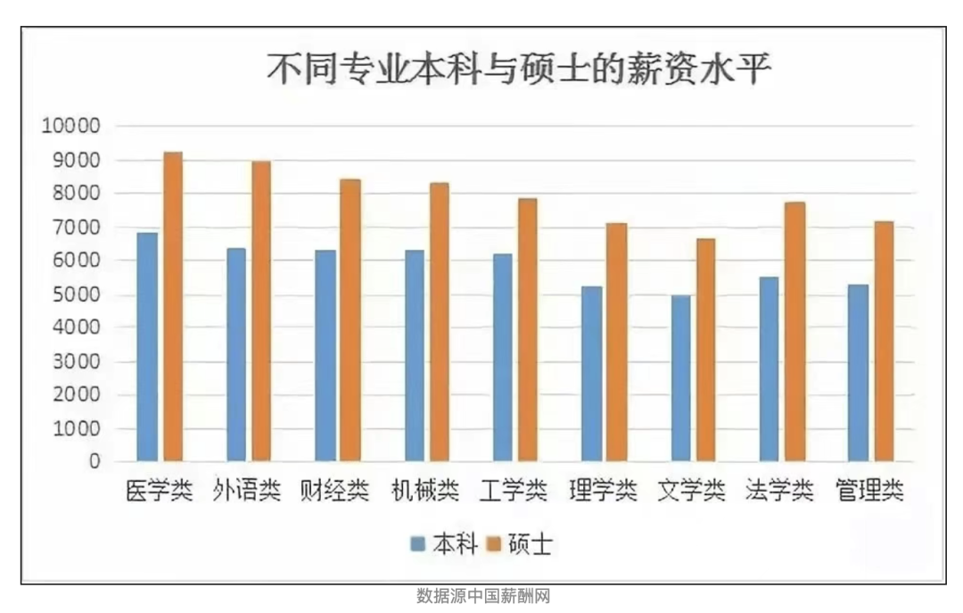 中国薪酬网的数据也印证了这一点:研究生学历毕业生薪酬普遍高于本科生,双一流高校研究生薪资高于普通高校,热门专业薪资高于一般专业。