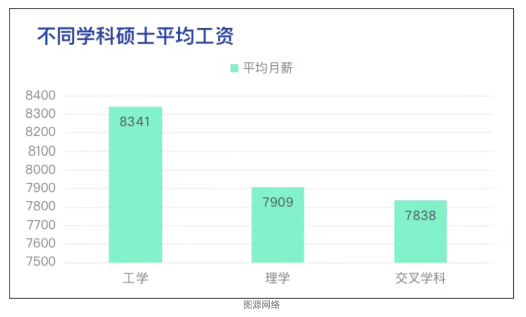 学科门类上,工学、理学、交叉学科薪资领跑,平均月薪分别为 8341 元、7909 元、7838 元。