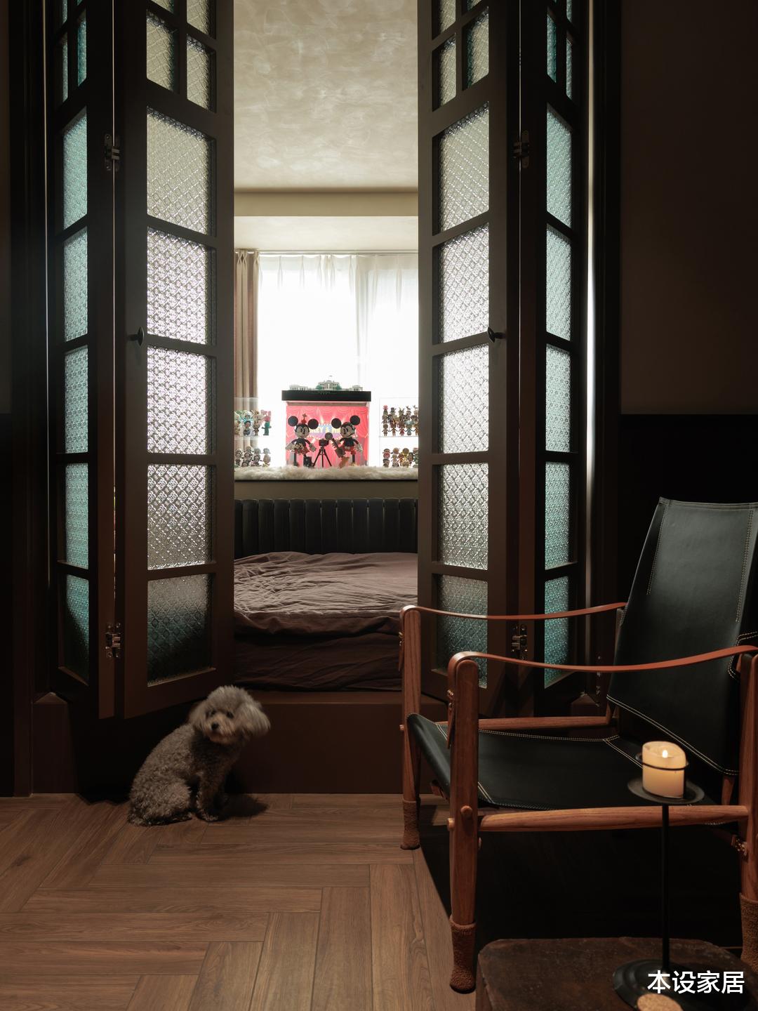 这是女儿的房间,与客厅之间使用海棠花玻璃折叠门隔开,让光线显得柔和又不失质感。