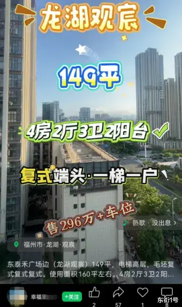 近日,东街1號在社交平台刷到龙湖观宸的一套二手房,149㎡毛坯四房报价296万元,折合单价仅1.99万/㎡,还送一个车位。这并非特殊楼层,而是在11楼端头,还是实用面积160㎡左右的复式产品。
