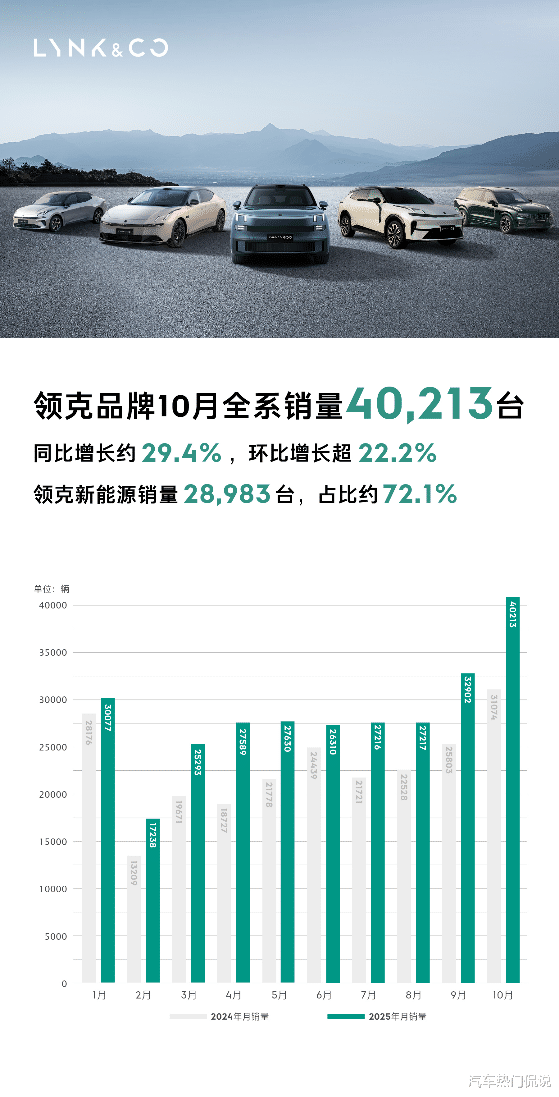【2025年11月1日,杭州】2025 年 10 月,领克品牌迎来历史性突破:单月销量达40,213 台,同比增长约29