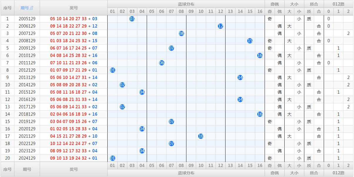 七、历史同期,蓝球开奖号码和走势图(历史数据演示):