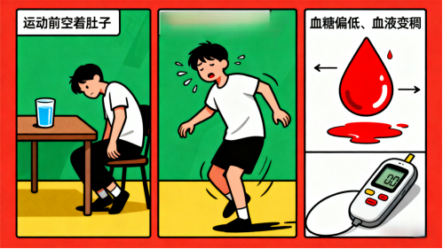 运动前“不吃不喝”为了“减重”或“省时间”,运动前不吃饭、不喝水。空腹会让血糖偏低,身体没“能量”;缺水会让血液变稠,循环变慢,心脏得更用力泵血,运动时很容易慌。