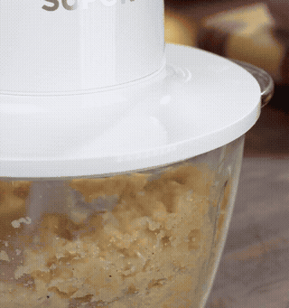 就像这样,搅成泥就对了。搅搅总比手剁省事,手剁太累人了。这样能让土豆和洋葱和鸡肉充分混合,吃起来才不会一口咬到柴的。