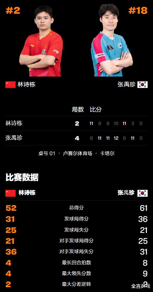 第二局林诗栋在领先后遭到张禹珍的搏杀追至3-3平,随后3-5被反超陷入被动,在接发球等环节出现漏洞被对方抓住机会,追回1分后连续出现失利4-10被张禹珍拿到6个局点,顽强追回4分后以被对方还了一个8-11比分。
