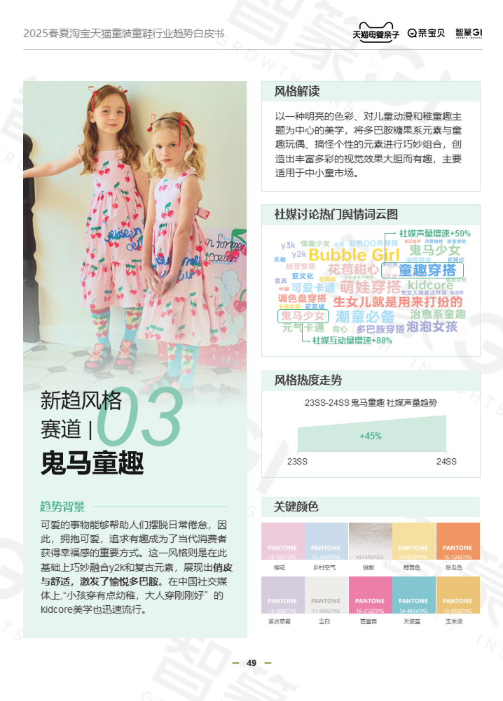 高增长风格赛道-千禧风Y2K复古未来感设计受追捧,反光材质、液态金属光感材质、立体波点与不规则解构成为爆款元素,女童中大童市场占比超28%,裤子、外套为核心品类,连衣裙为趋势品类,袜套、手袖等个性化服配品类值得关注。