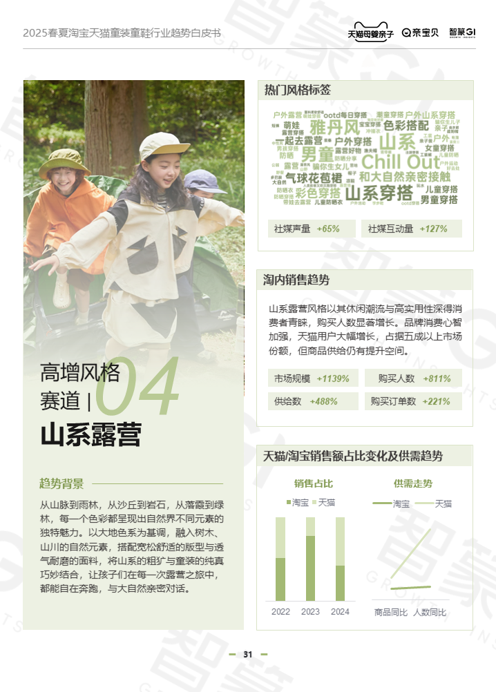 男童占据市场主导,裤子、外套、户外鞋为核心消费品类。近年来女童消费增速突出,山系露营风连衣裙消费趋势显著。山系色彩逐步加入明亮色系,花朵、圆润线条、花苞裙型逐步融入,为硬朗山系风格增添甜美感,以满足女童穿搭需求。