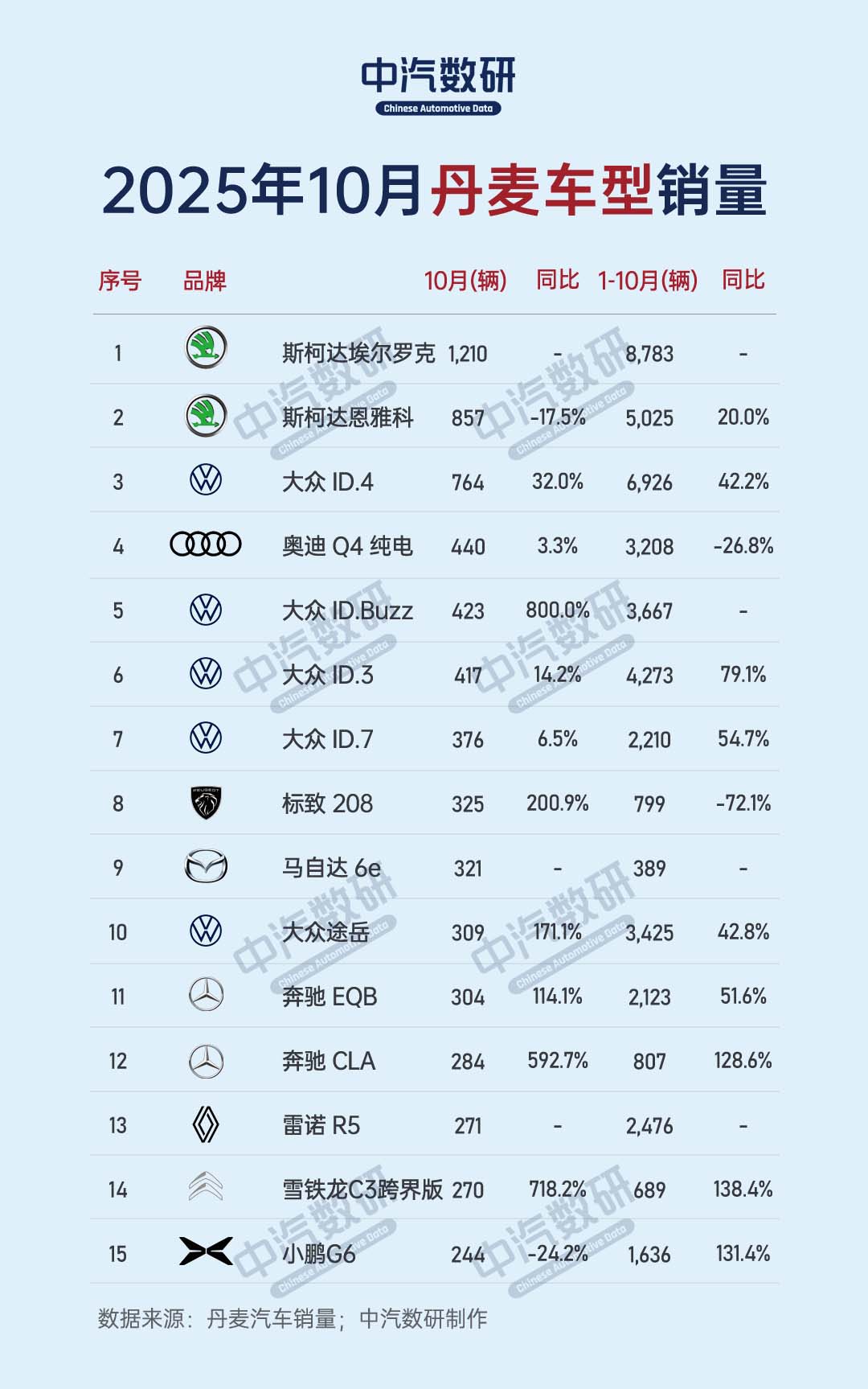 丹麦汽车车型销量TOP3分别为:斯柯达埃尔罗克,10月1210辆,1-10月8783辆;斯柯达恩雅科,857辆,1-10月5025辆;大众 ID.4,10月764辆,1-10月6926辆。