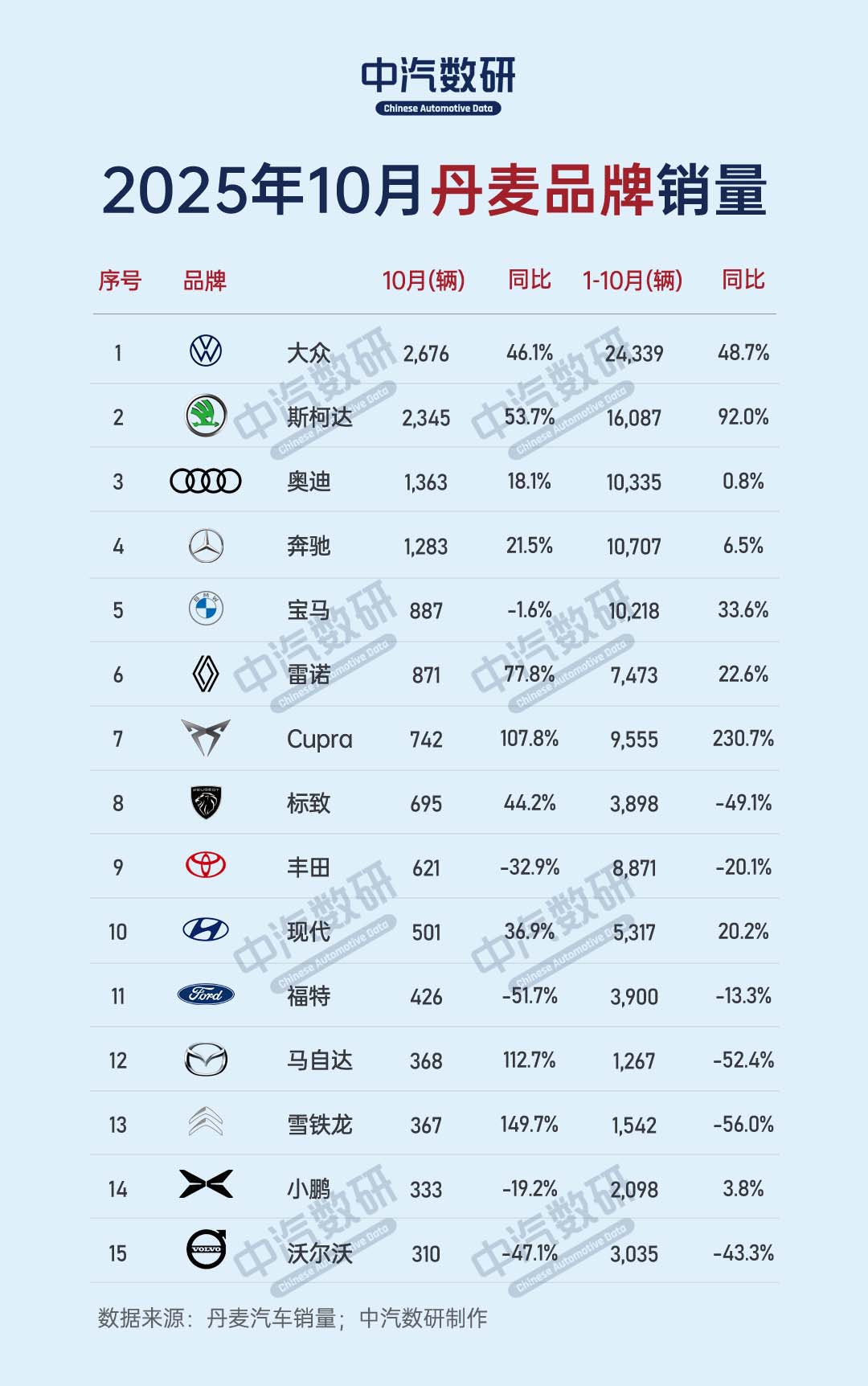 丹麦汽车品牌销量TOP3分别为:大众,10月2676辆,1-10月24339辆;斯柯达,2345辆,1-10月16087辆;奥迪,10月1363辆,1-10月10335辆。