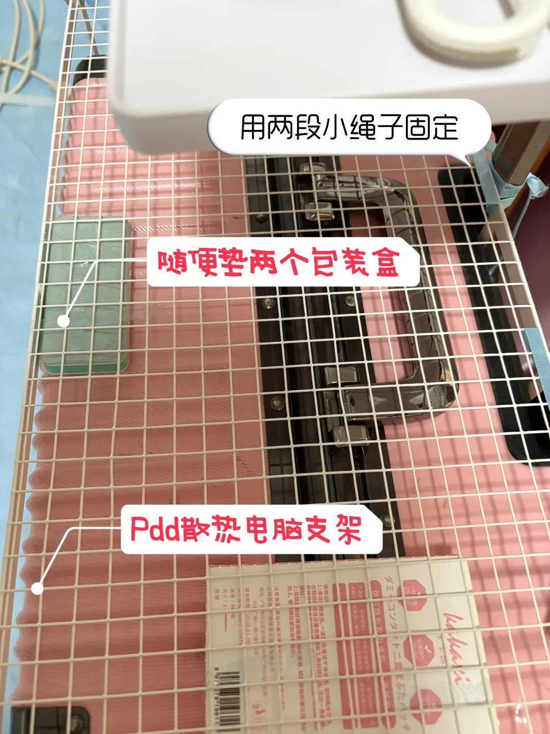 上面放一个笔记本散热支架,在拉杆的两端用绳子固定起来,不平整的话,可以在三个位置垫高用包装盒就可以拉杆上面安装了置物托盘,只要不放太重的东西都是可以的,