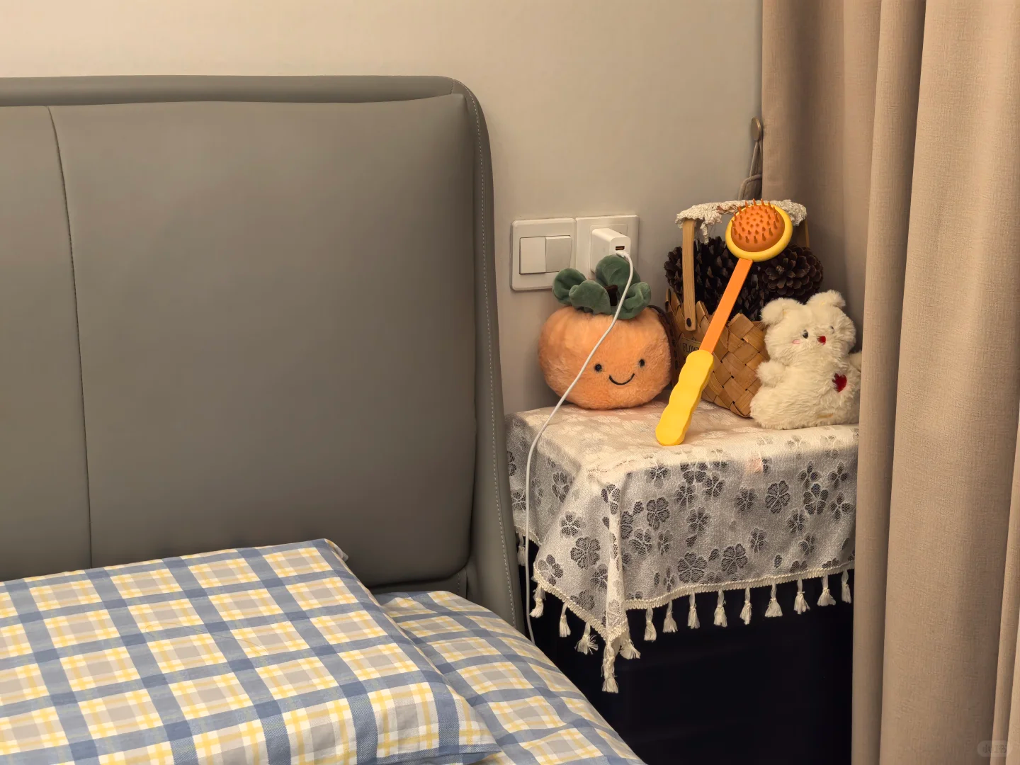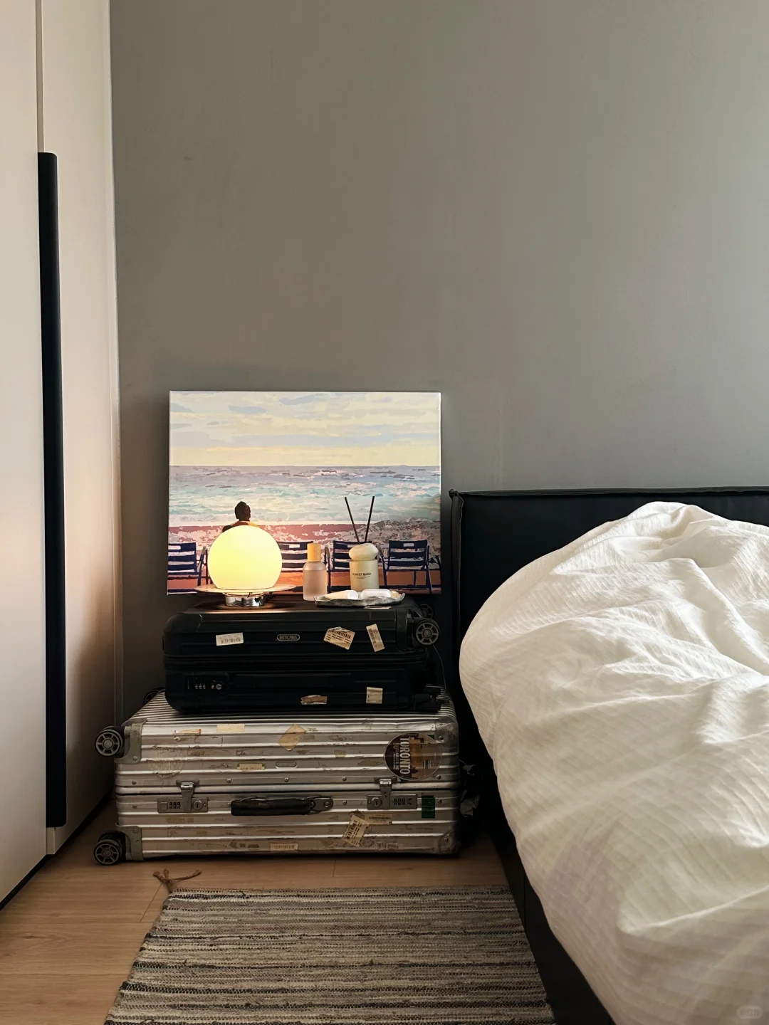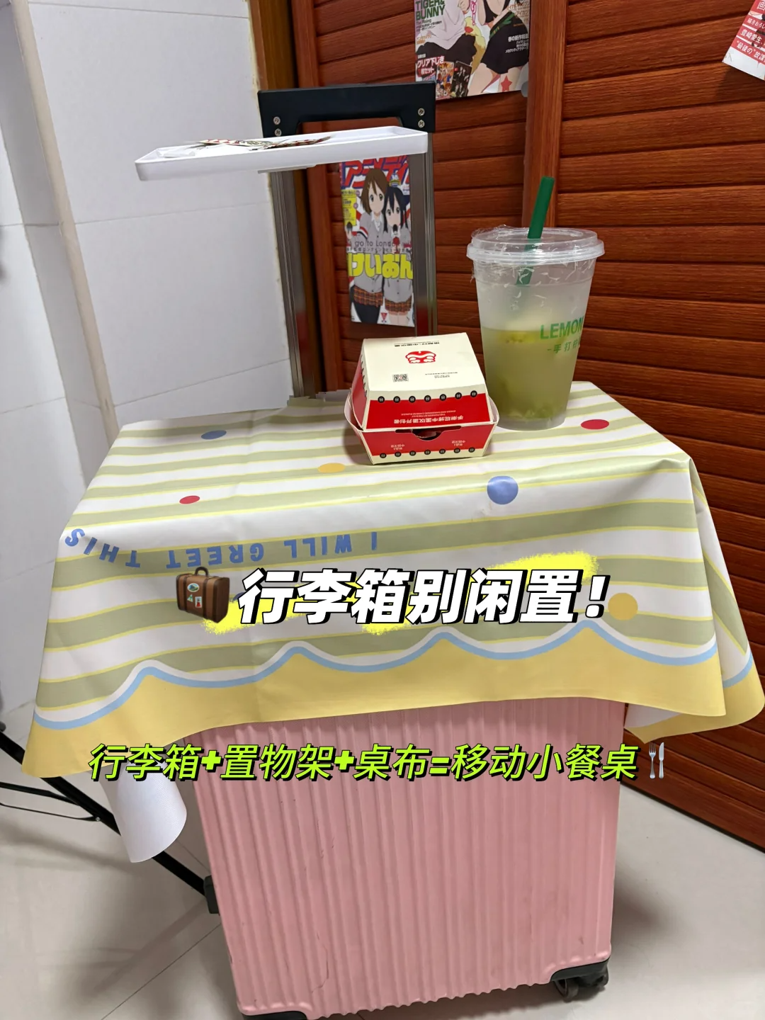 同样也可以代替床头柜,还可以使用亚克力的板子固定在行李箱的上面,这样行李箱就平整多了,可以用来放水杯,台灯,给手机充电。