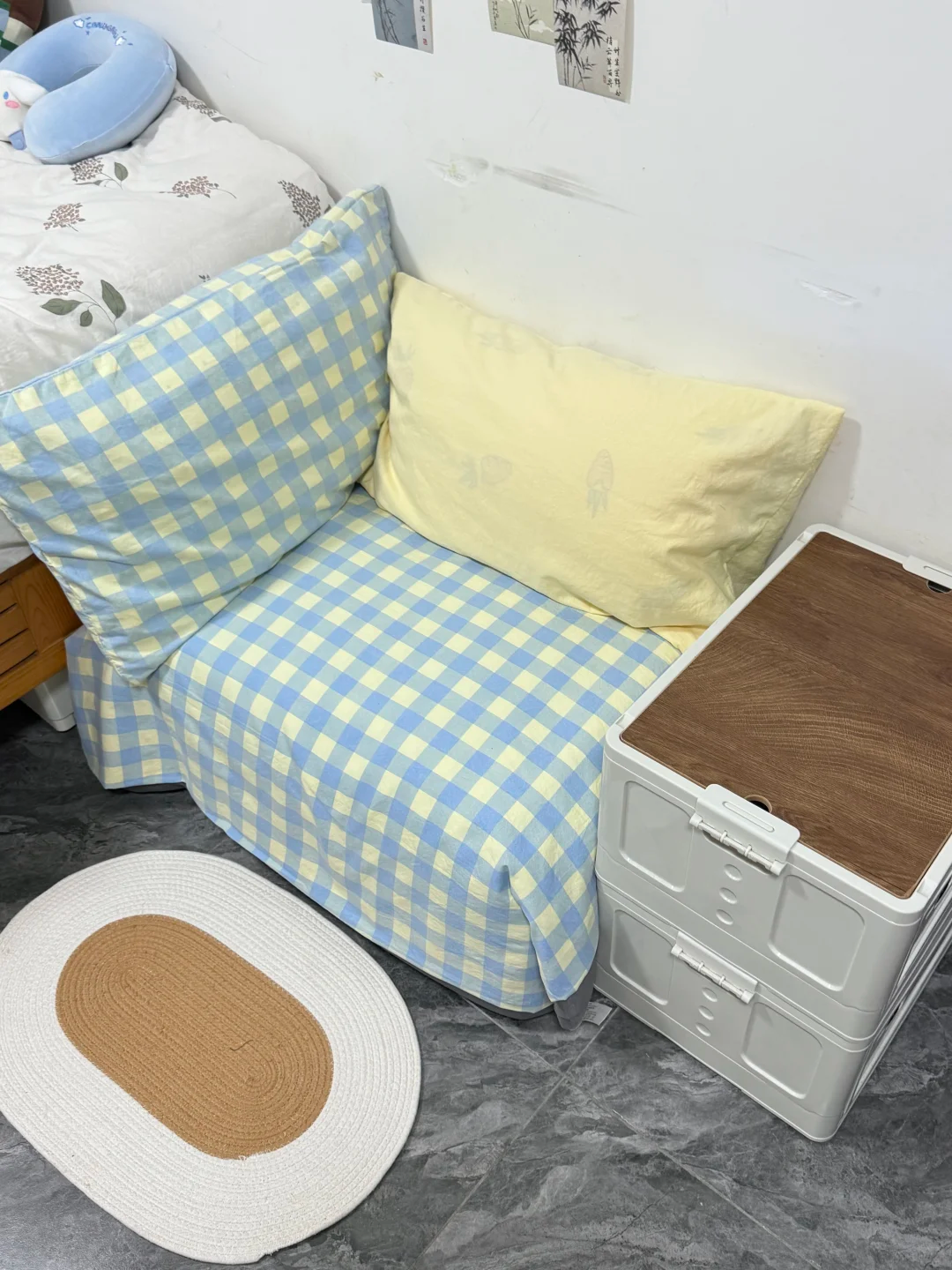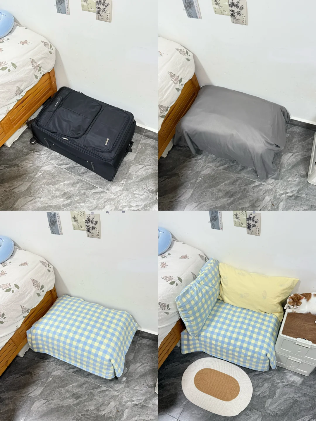 放上两个靠枕就可以了,再也不用犯愁,行李箱放在哪里了,家里还多了一个小沙发,坐在上面承重完全够。