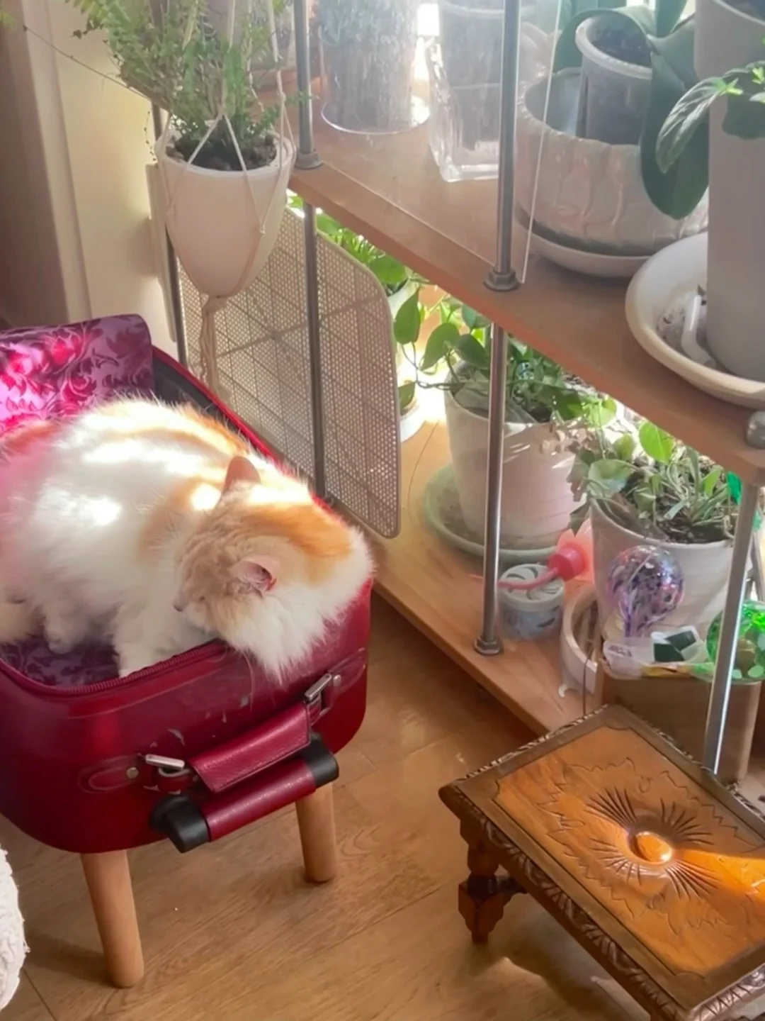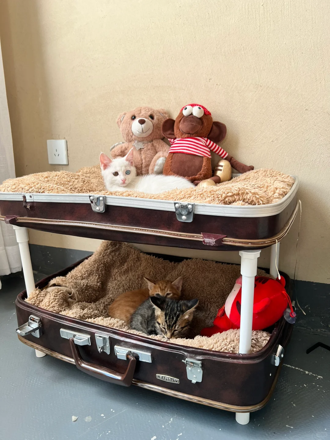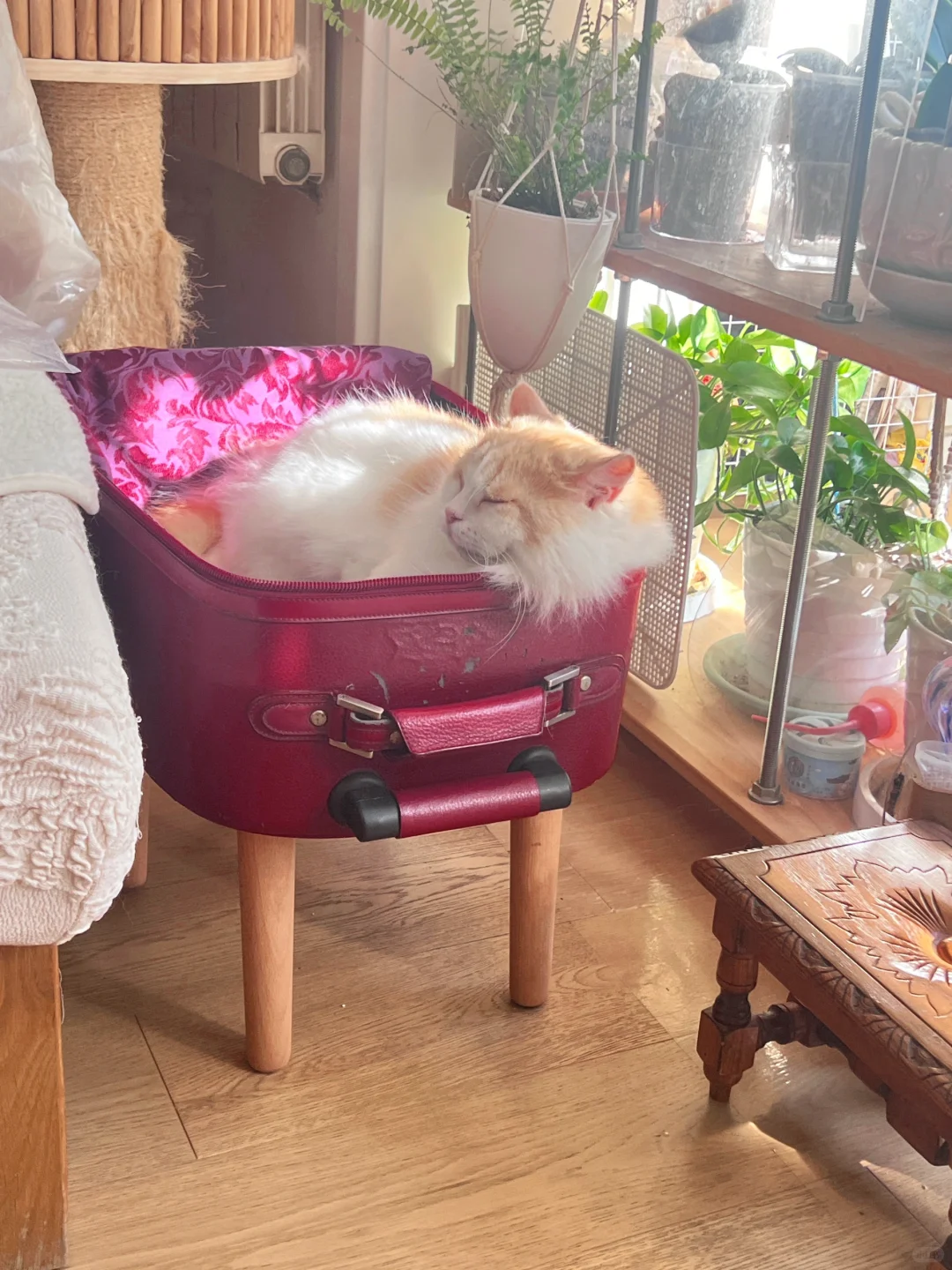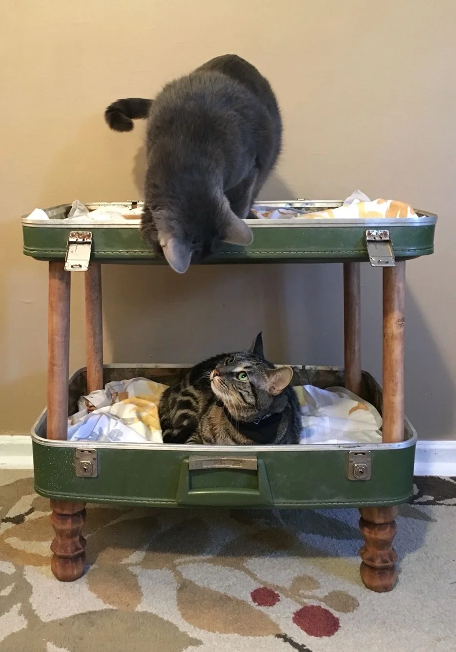 可以在网上购买4个木质的桌腿,然后把它安装在行李箱的底部,这样就变成了一个复古风的猫窝,铺上垫子,好看的不得了。