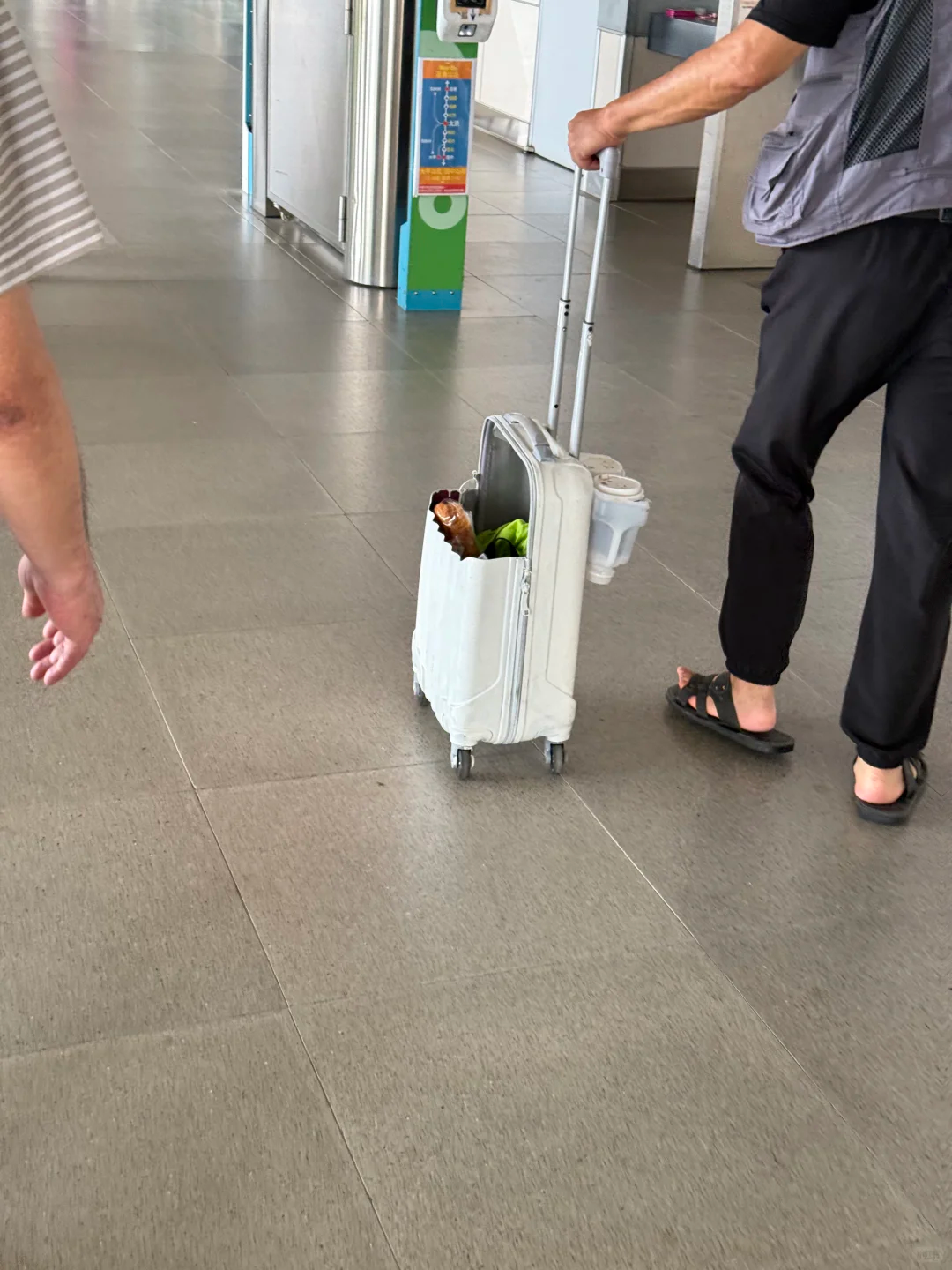 将不用的行李箱上半部分剪开一点,买的菜就可以直接放在里面了,推着回家,特别省力,环保主义者将不要的旧行李箱又重新利用了。