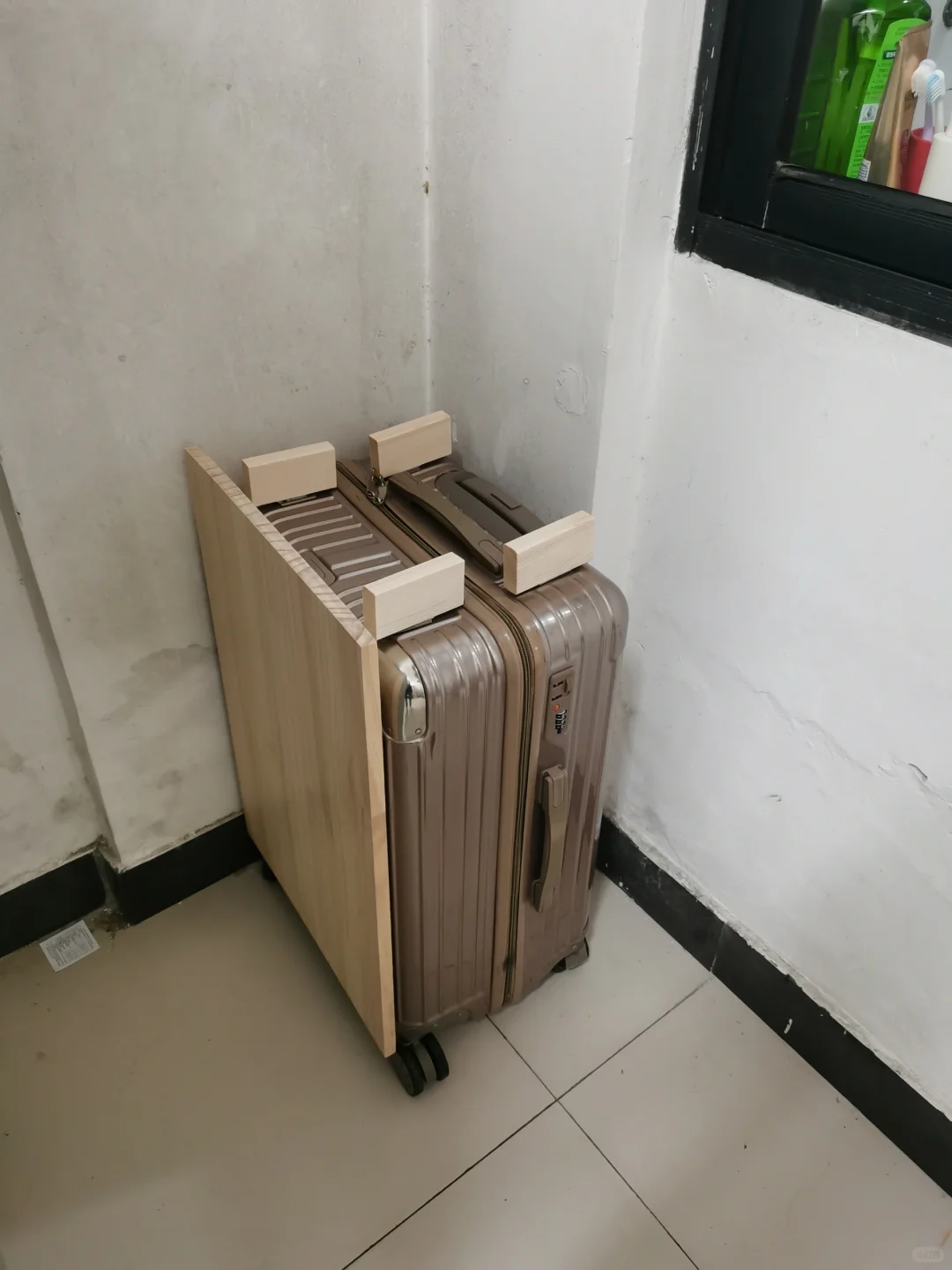 分享另一个行李箱变身移动小桌子的方法,这样更加简单,直接网购小桌板和角铁磁吸一共成本不到30元,把桌板固定在行李箱的侧面,利用角铁和磁吸。