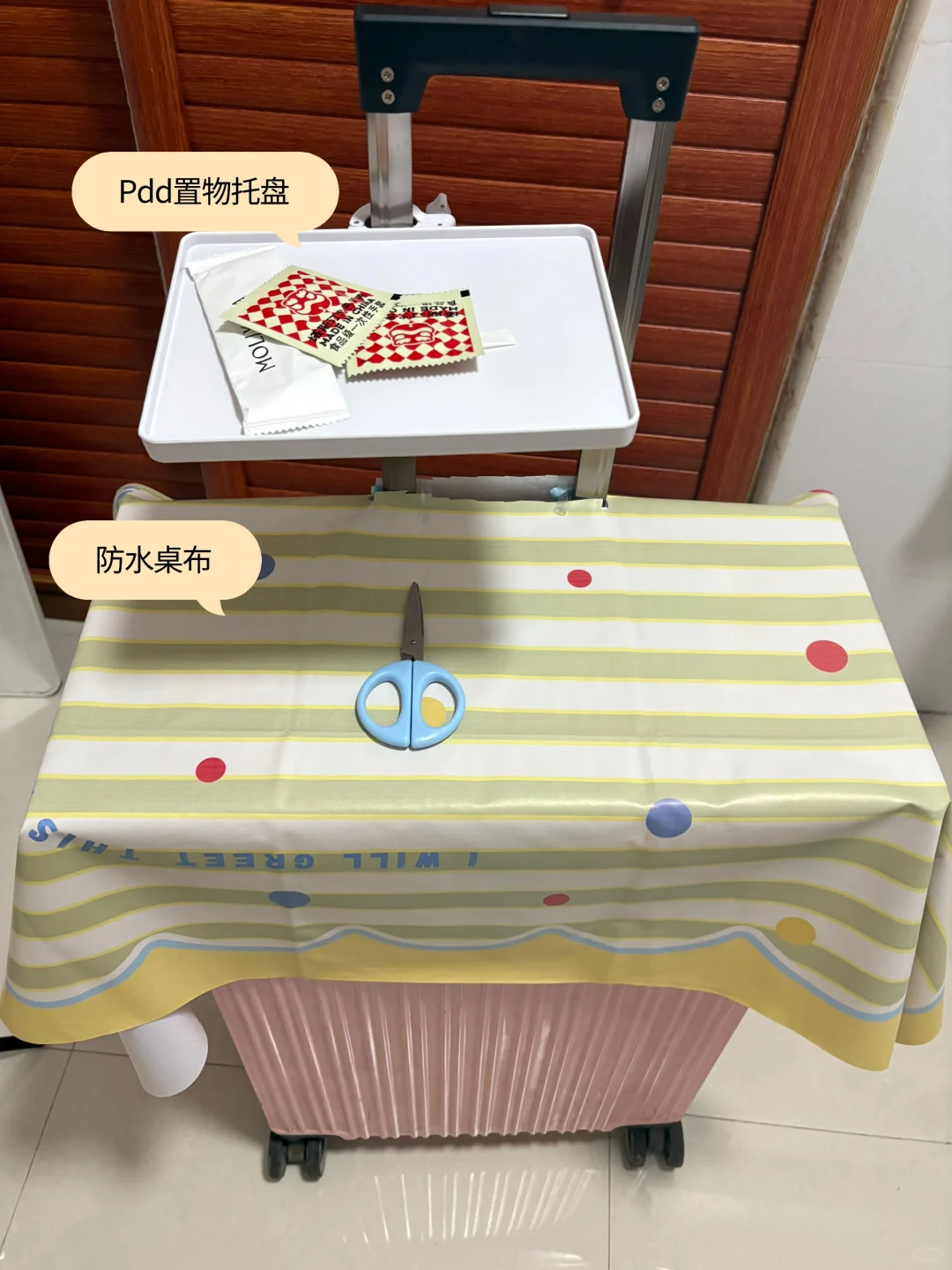然后铺上好看的桌布,对着拉杆的位置用剪刀剪开一个口,注意不要剪太大,这样就完成了,不用行李箱的时候,它就成了一个移动的小车,可以当做临时的工作台,化妆台。