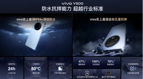 除此之外,vivo Y500还有着vivo史上最强的防水和抗摔实力。经过实测,这款手机直接丢水里泡,而且是泡上24小时后手机居然完全没事。看来该机的IP69+满级防水确实是强,而且这款手机还有着主板级防水实力,防水堪称满分。抗摔方面,实测这款手机基本无惧跌落,不管是站着使用手机时从手里跌落摔地面,还是手机在桌面上被碰到跌落,最后手机都完全没事,能够正常使用。