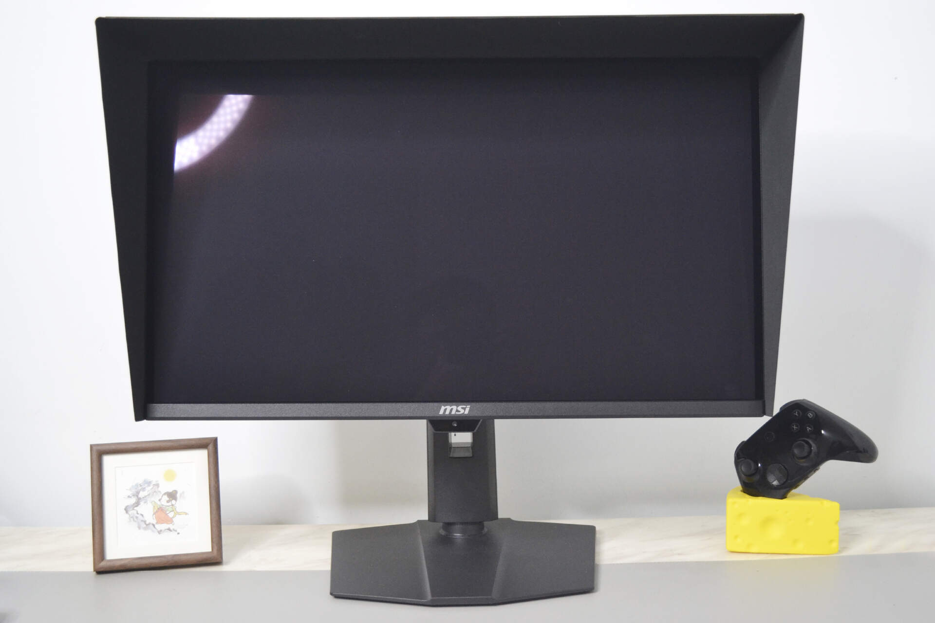 配件方面,磁吸式可折叠遮光罩堪称点睛之笔:安装便捷、收纳时不占空间,能有效隔绝环境光干扰,大幅提升画面对比度,让玩家在强光或复杂光线环境下也能沉浸于游戏世界。背板采用金属拉丝工艺,左侧龙盾标识延续微星经典电竞基因,顶部ARGB灯效铭牌可通过MSI Center软件与其他硬件实现灯光同步,电竞氛围感直接拉满。