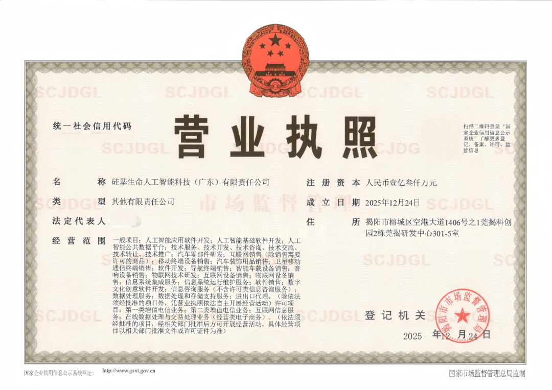 据悉,硅基生命人工智能科技(广东)有限责任公司为四川硅基生命人工智能科技有限公司在揭阳设立的全资子公司,母公司作为西部科技创新领军企业,长期聚焦人工智能、仿生科学、脑机交互及硅基生命体研发等前沿领域,致力于构建“硅基生命体+智能机械”协同进化生态系统。