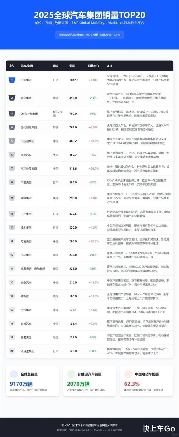 迈入2026年,2025年全球车市的成绩单陆续浮出水面,备受关注的”2025全球汽车集团销量TOP10”榜单也在最近正式发布。这份榜单不光能看出全球车企的竞争情况,还能明显感受到三大变化:新能源早就成了主流,“出海”成了车企增长的关键,而且强的越强、弱的越弱的趋势越来越明显——传统巨头没以前那么稳了,中国车企靠着技术和产品的优势,已经从跟着跑变成领着跑,全球车市的格局悄悄变了样,接下来就一起看看闯进前十的这些汽车集团,到底表现如何。