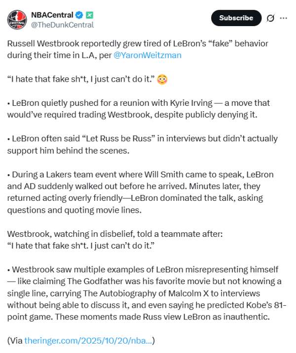 10月21日,The Ringer记者Yaron Weitzman更新长文,描述了拉塞尔-威斯布鲁克与勒布朗-詹姆斯在湖人期间的矛盾。