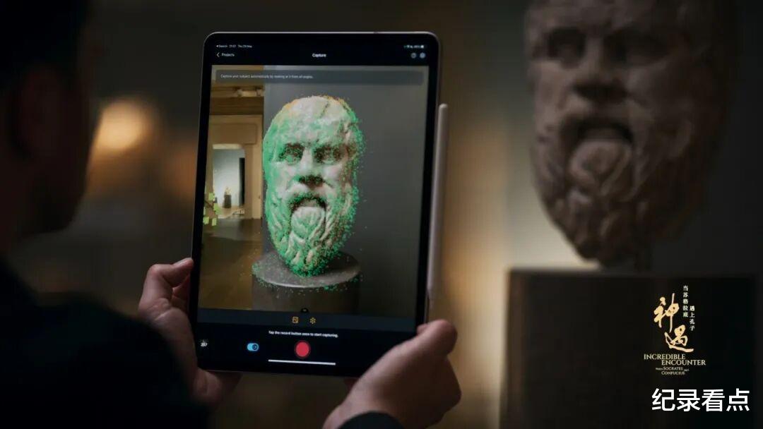 创作团队远赴英国大英博物馆,扫描馆藏的1世纪罗马苏格拉底胸像,在中国曲阜运用无人机对72米的巨型孔子铜像进行全方位3D扫描,再结合文献记载,以照片级的写实标准复原了两位哲人的面容与神态。