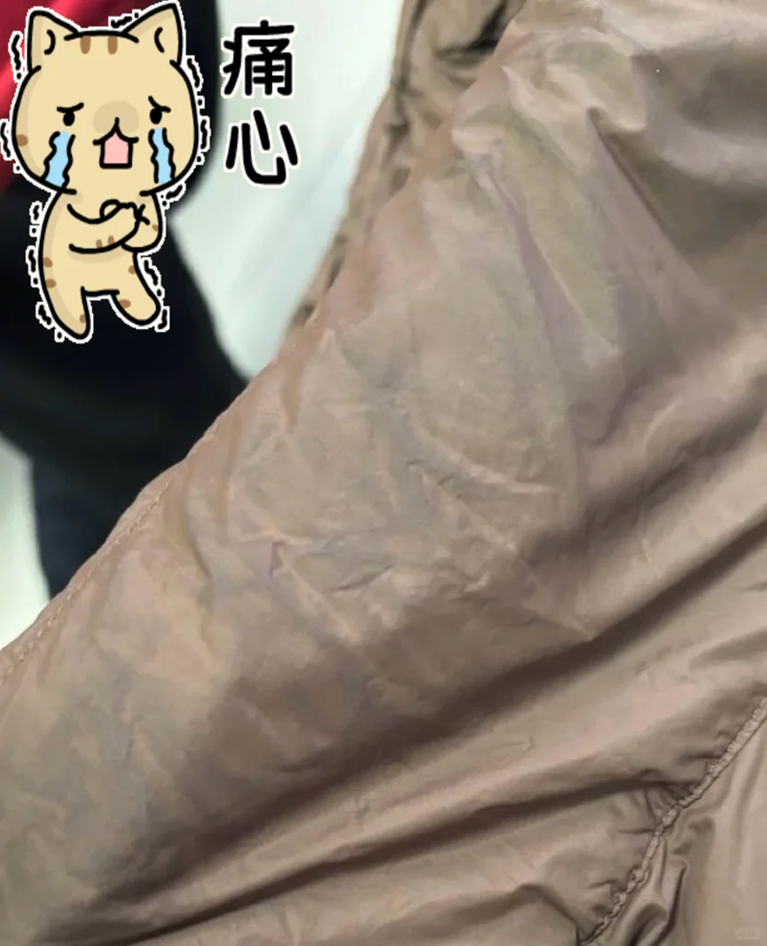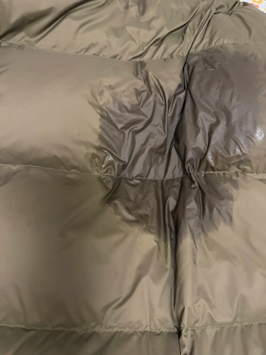 如果是锦纶面料的羽绒服,那么沾上一点点水就会有印子,不仅容易破,而且还很容易变脏。