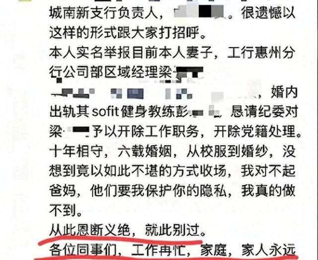 2025年7月,广东惠州某银行支行负责人黄某的举报信掀起巨浪。他实名控诉同单位妻子梁某出轨健身教练彭某长达半年,更曝光妻