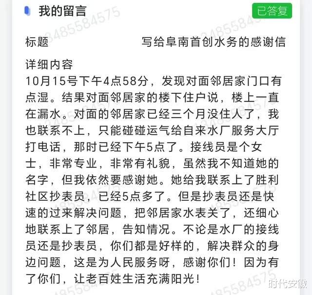 近日,县城一长期无人居住的房屋中厨房水管破裂,自来水向门外渗出,邻居鲍安常拨打自来水厂服务大厅电话求助,抄表员工接到信息后立即前去处置,消除了安全隐患。为此,鲍先生特地通过12345热线平台表扬并感谢阜南首创水务员工。