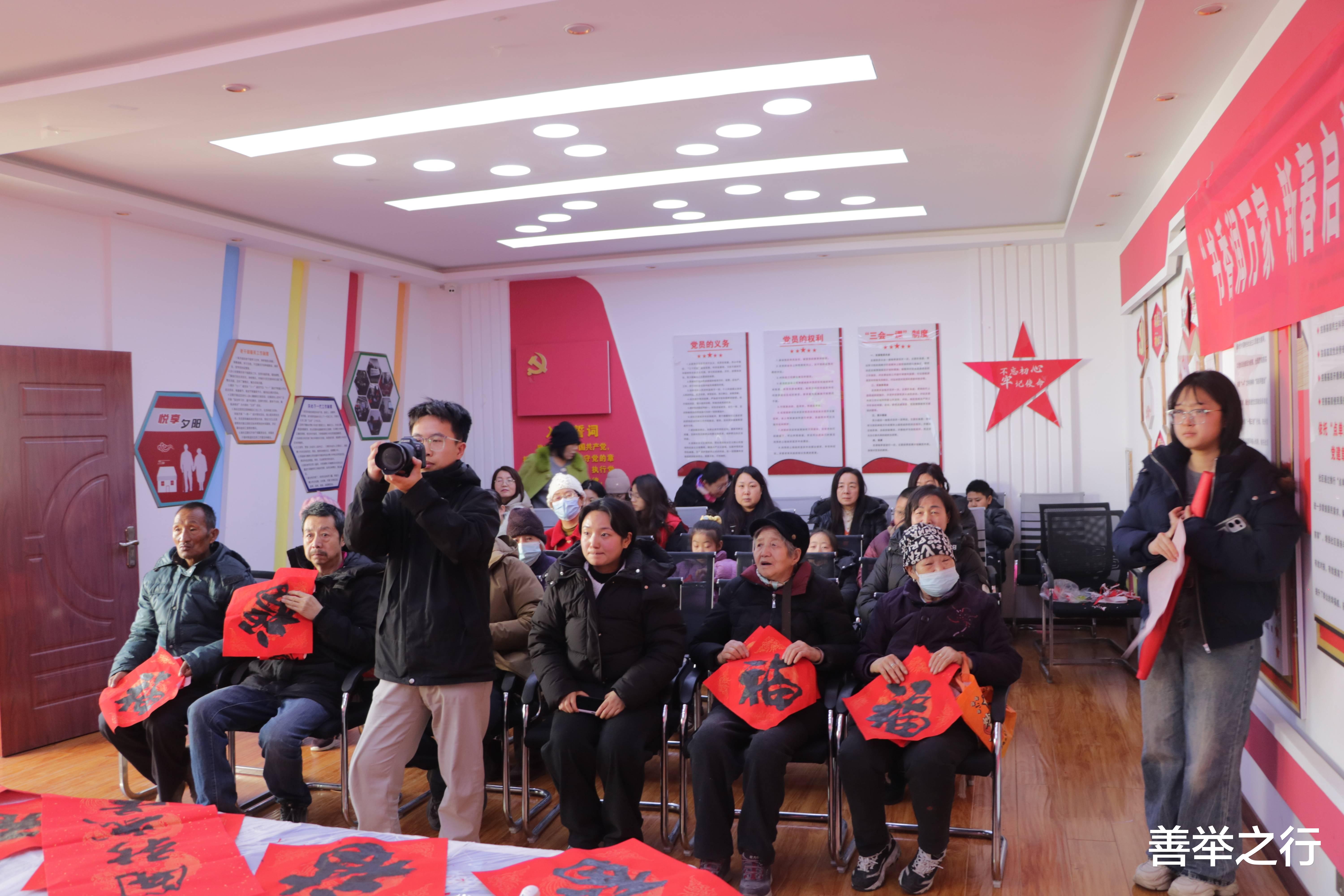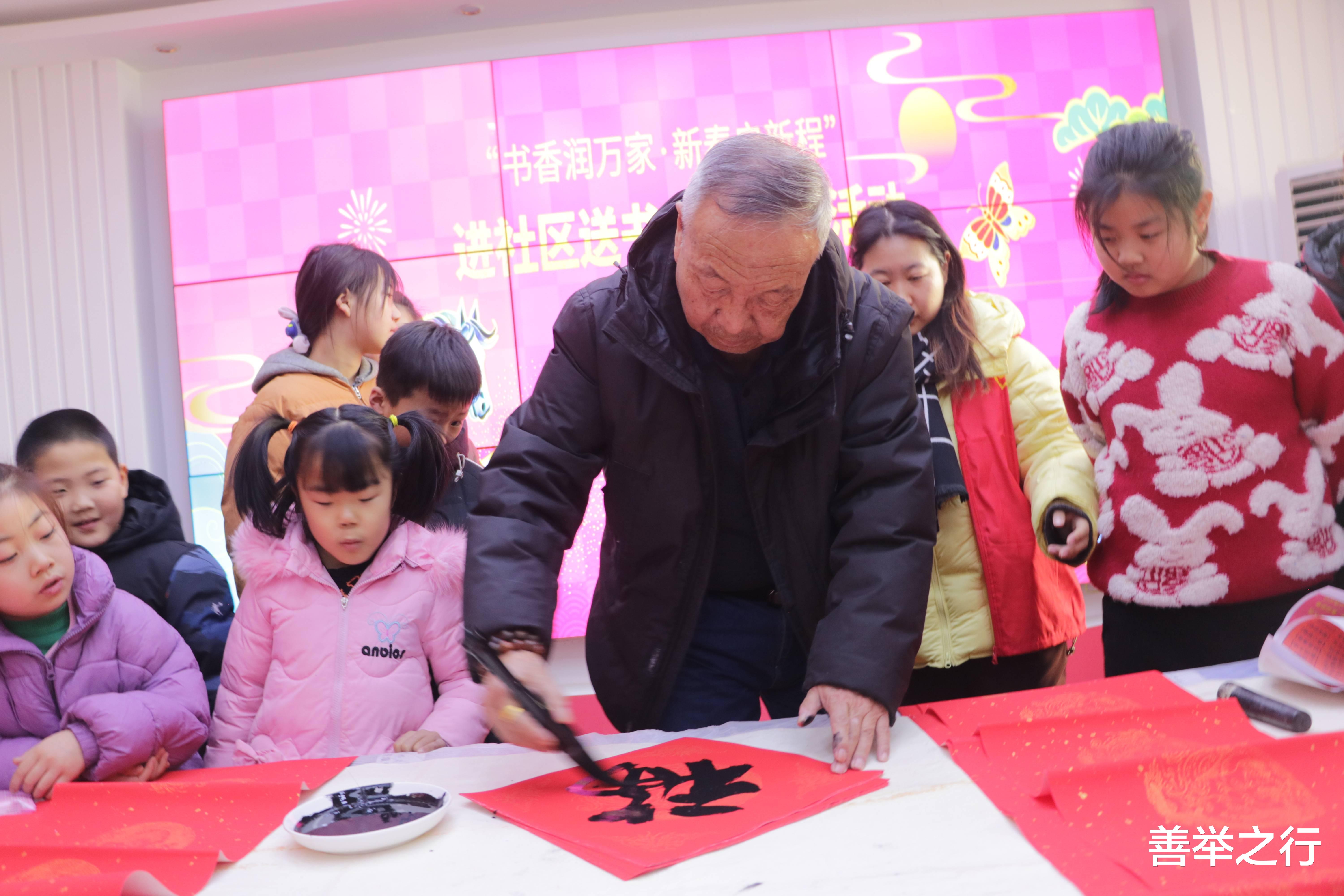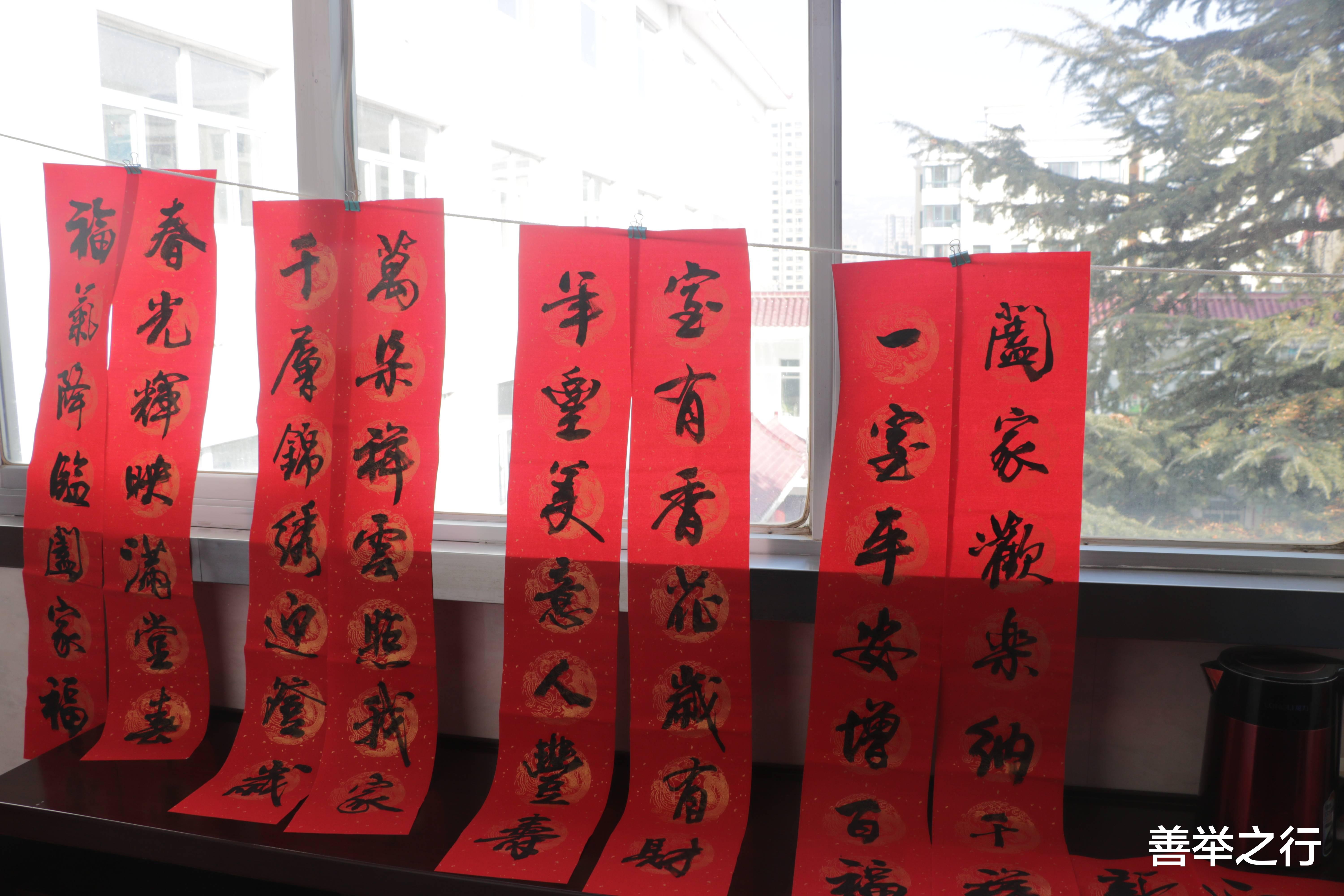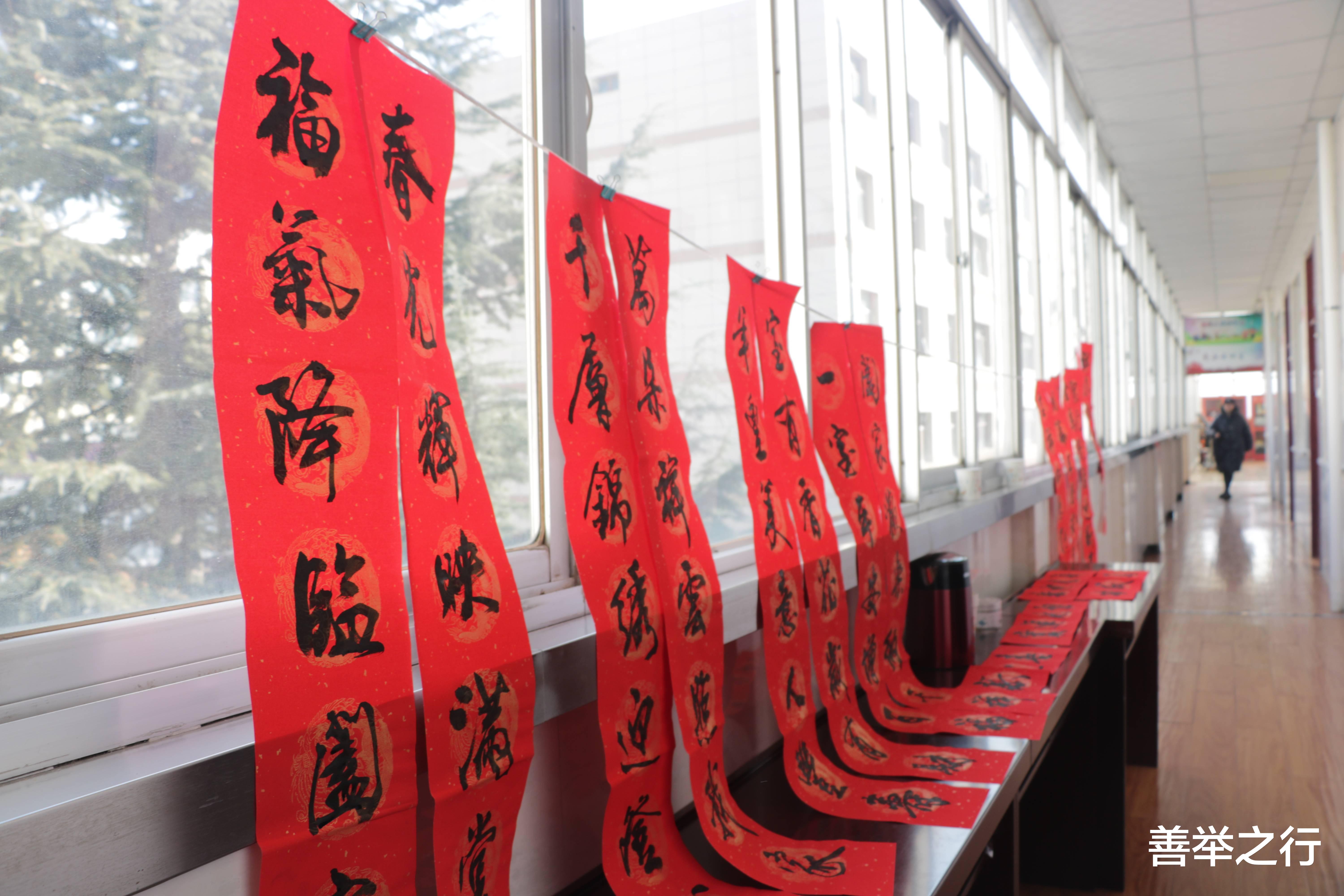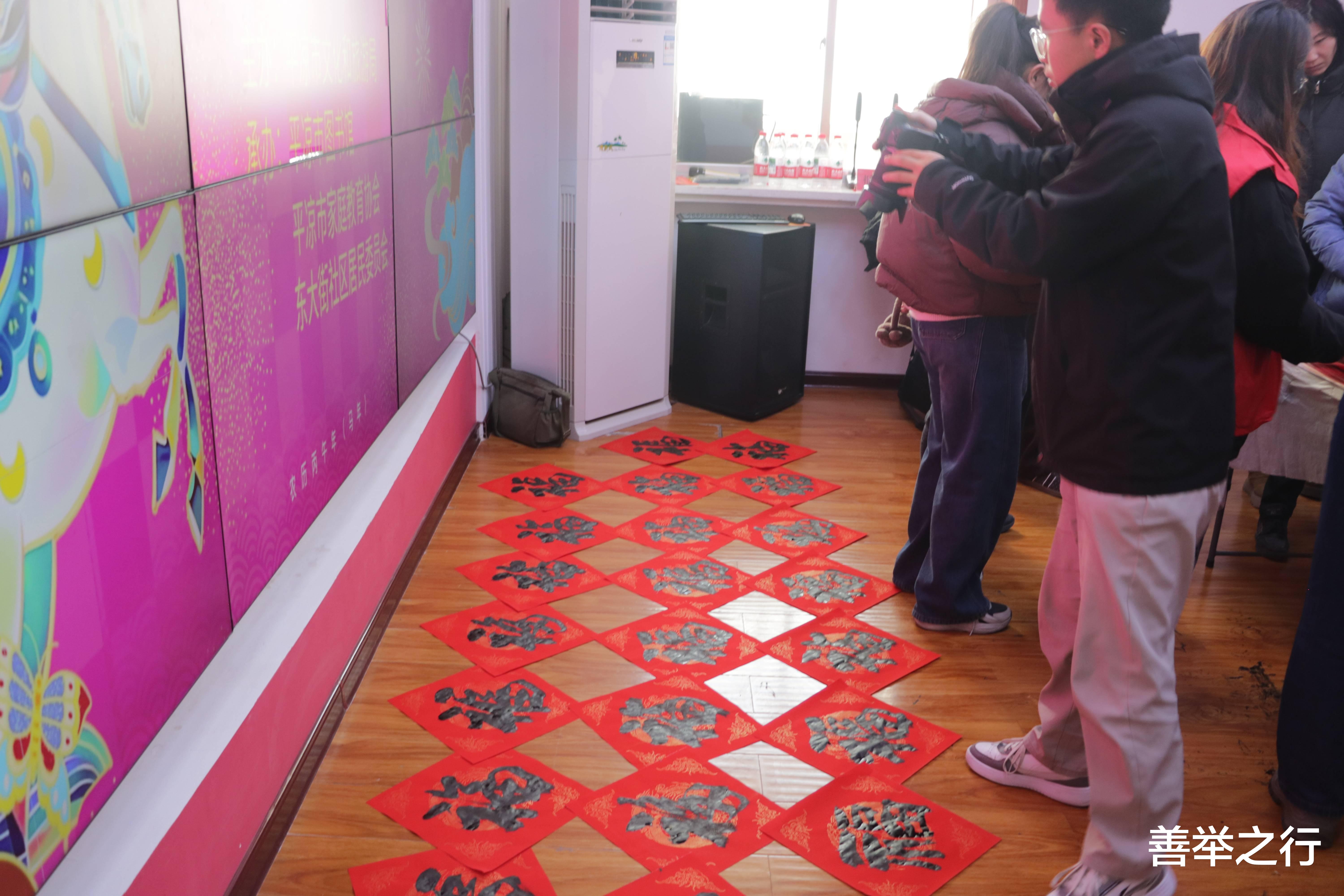 红纸翻飞,墨香四溢。活动现场,邀请到中书协会员张宪平,一到活动现场他挽袖执笔,将浓浓的祝福倾注笔端。“福气降临和家褔,春光辉映满堂春。万马奔腾!”“银蛇含珠辞旧岁,金马送财迎新春”……一幅幅寓意吉祥、满载祝福的春联接连而出。志愿者们铺纸晾晒,欢声笑语交织着氤氲墨香,新年的喜气弥漫在各个角落。