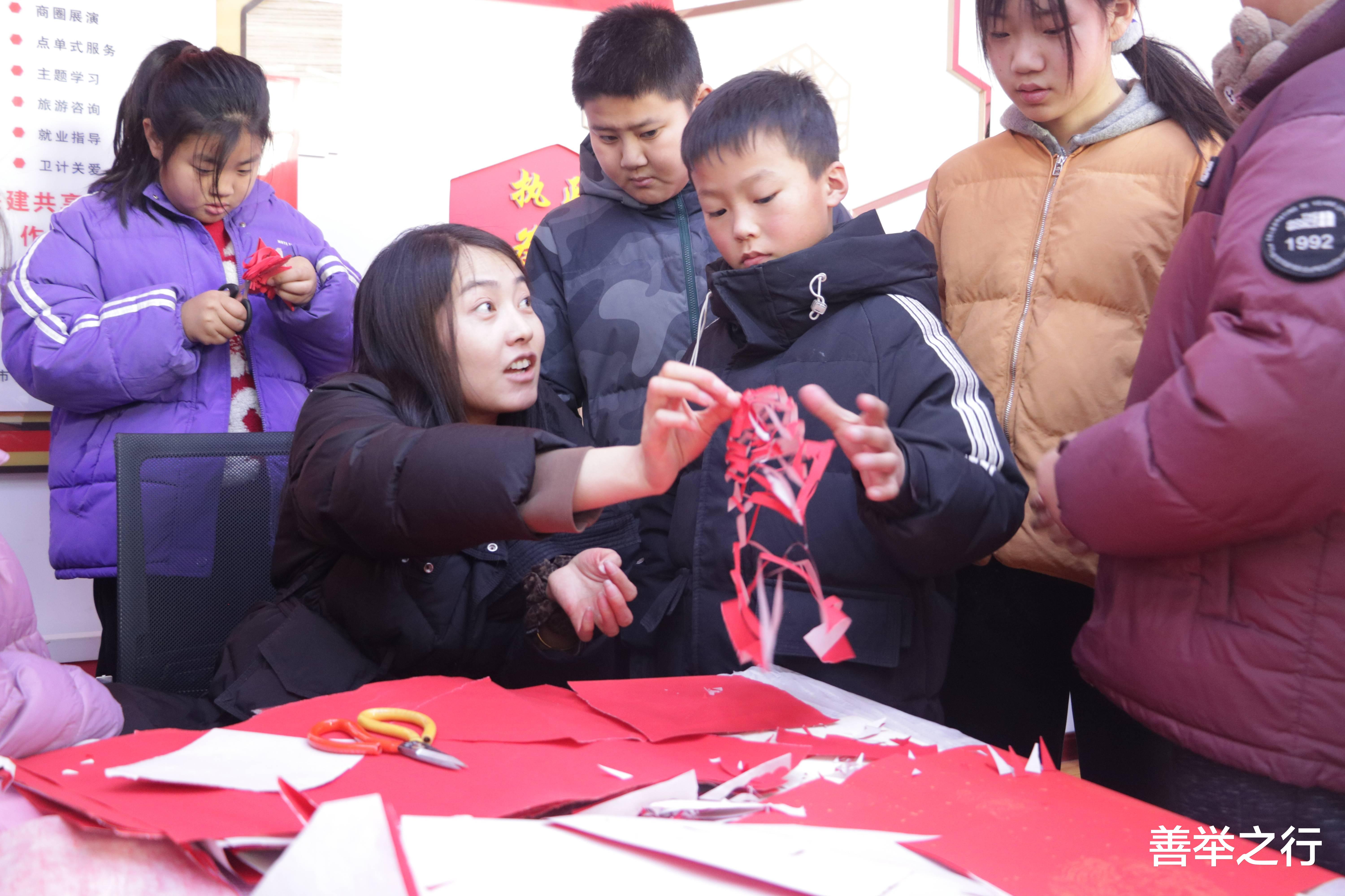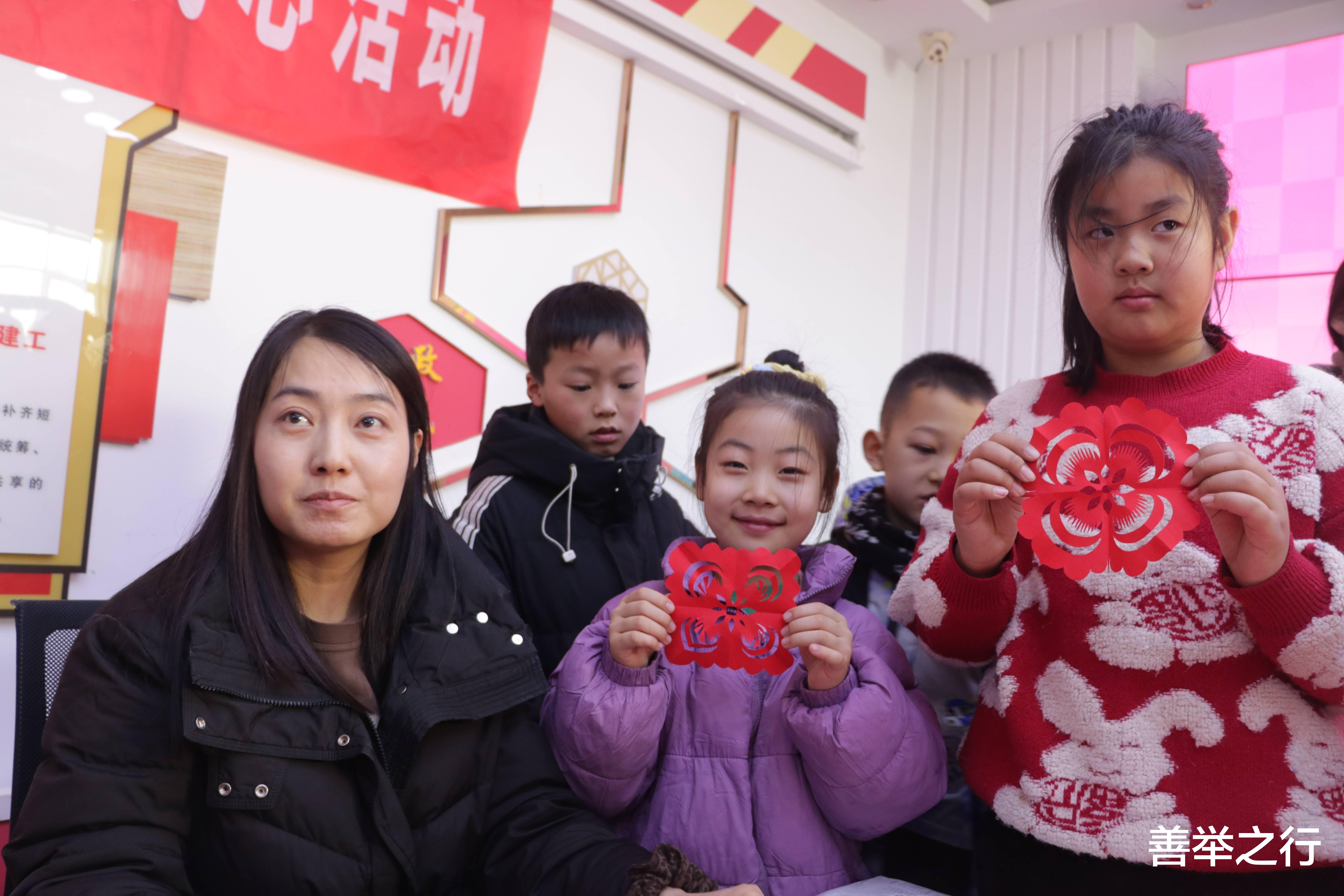 邀请到平凉剪纸传承人何霞的传人何倩女士, 活动现场 她指尖抚过红纸面的凹凸纹路,绐现场的小朋友手杷手教基础剪纸并讲解要领。