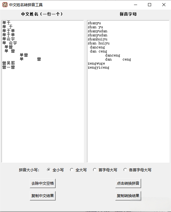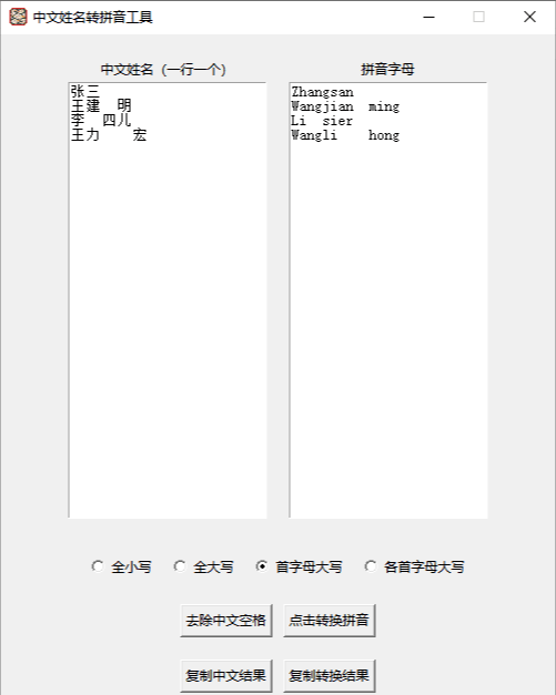 1、用于批量转中文姓名为拼音,支持选择全小写、全大写、首字母大写(整个拼音字符串的第一个字母大写)、各首字母大写;