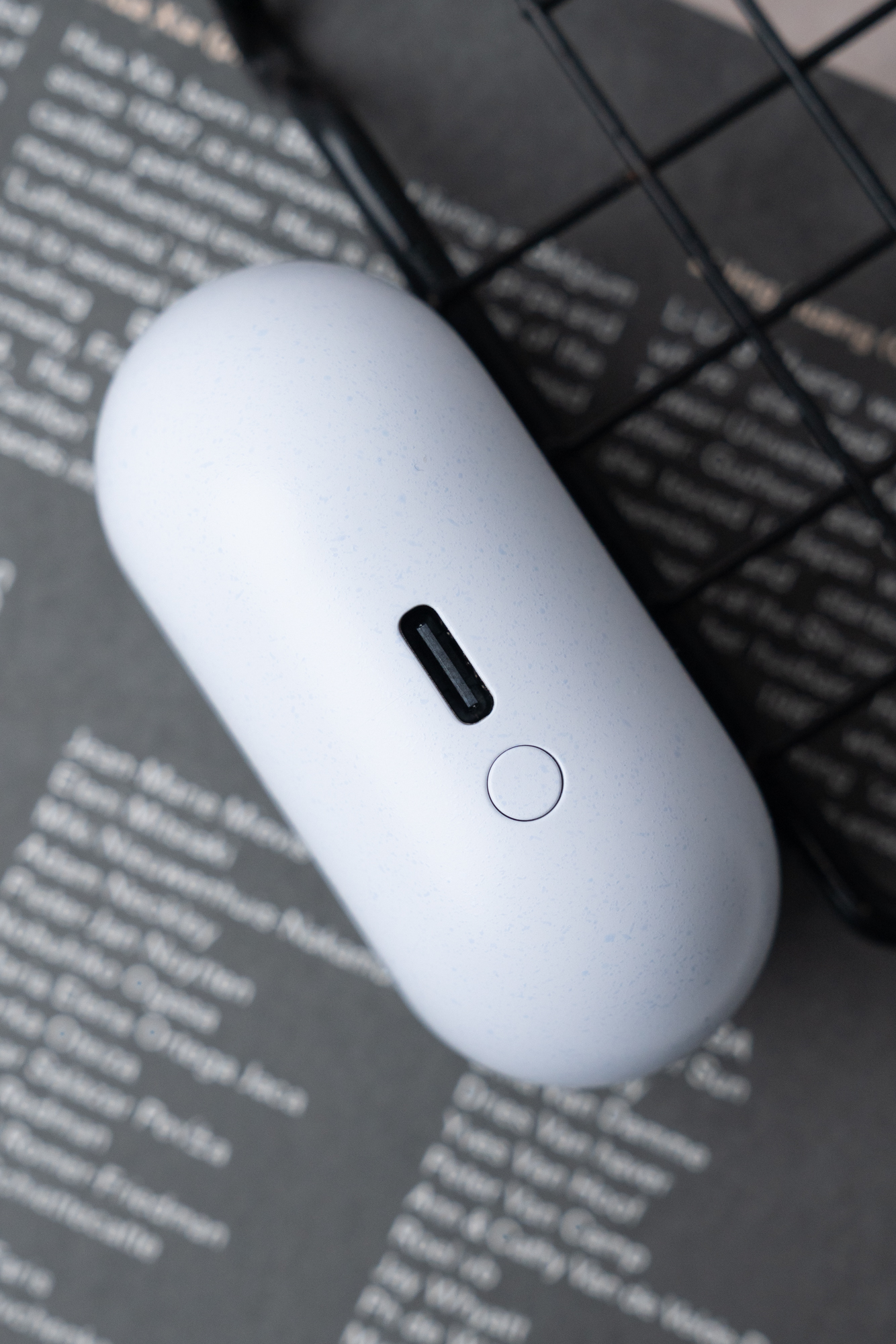 我手上这款是浅云白,外观简约大气,表面磨砂的材质搭配浮点工艺,质感很不错。打开耳机仓,开盖的阻尼感拿捏得恰到好处,很舒服。