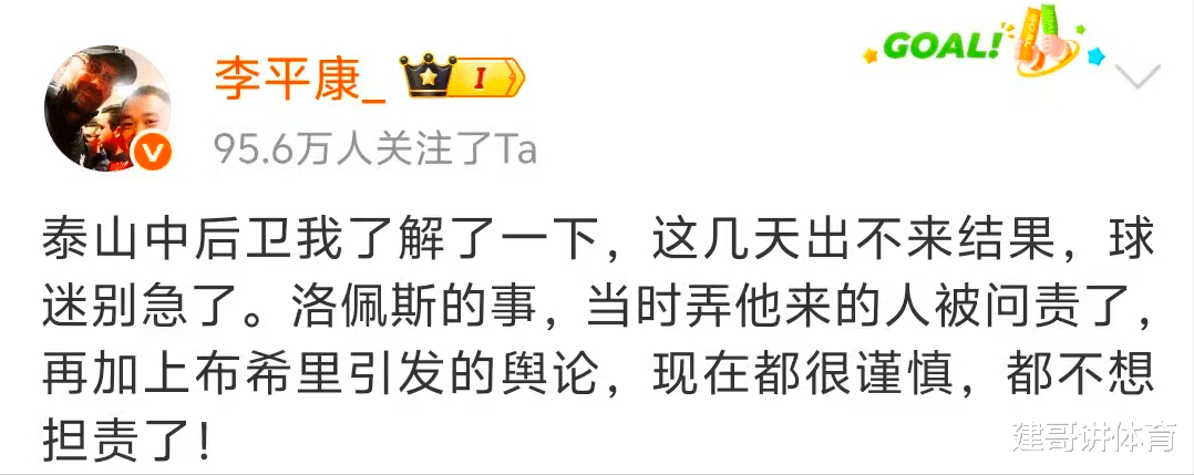 北京时间1月12日,在山东泰山队绯闻中卫已经多达了4人后,谁能最终接替洛佩斯加盟山东泰山队,好像一直没有明确的说法,对于泰山队外援中卫的情况,名记李平康再次更新社交,给山东球迷带来了他掌握的最新消息,李平康称泰山队的中卫这几天也不会出来结果,因为洛佩斯的事情,当时弄他来的已经被问责了,再加上布希里引发的舆论,导致现在都很谨慎,都不想在引援方面拍板担责了。