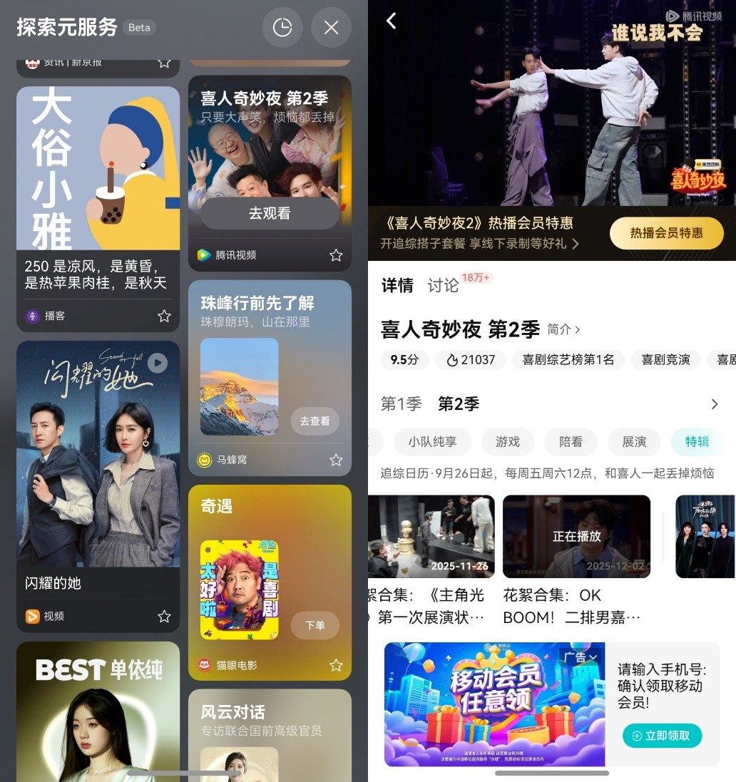 没课的下午或者没有作业的夜晚,是我们大学生最典型的“杀时间”场景。进入负一屏,在底部轻轻上滑进入「探索元服务Beta」,遇到了的卡片。不需要我再去打开App、搜索,点击卡片直接一键直达《喜人奇妙夜2》的播放页面。这种“无缝衔接”的爽感真的是“旦用难回”。