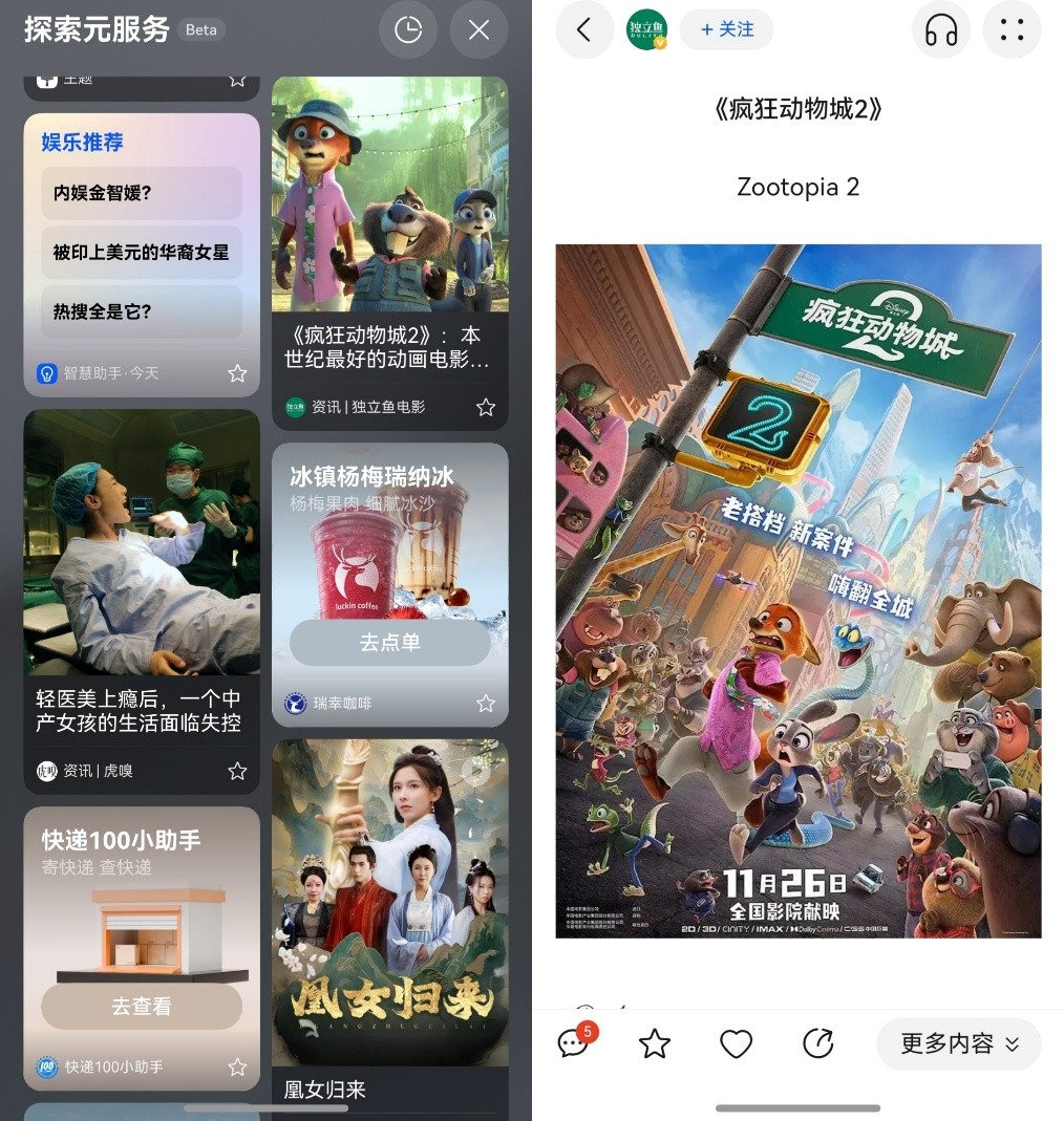 更让我惊喜的是它的推荐机制。这不《疯狂动物城2》最近正在热映,我就在「探索元服务Beta」里刷到了猫眼电影的元服务,立刻下单!看完之后,还在回味朱迪和尼克的冒险的我,又在「探索元服务Beta」里刷到了一篇深度的剧情解析文章和彩蛋挖掘。它似乎捕捉到了我的兴趣余温,并及时输送了高质量的增量信息。这种“世界与我相关”、但又不过度“干扰”的弱个性化推荐,很好兼顾了我的个性化需求,并在潜移默化中帮我拓宽了认知视野。
