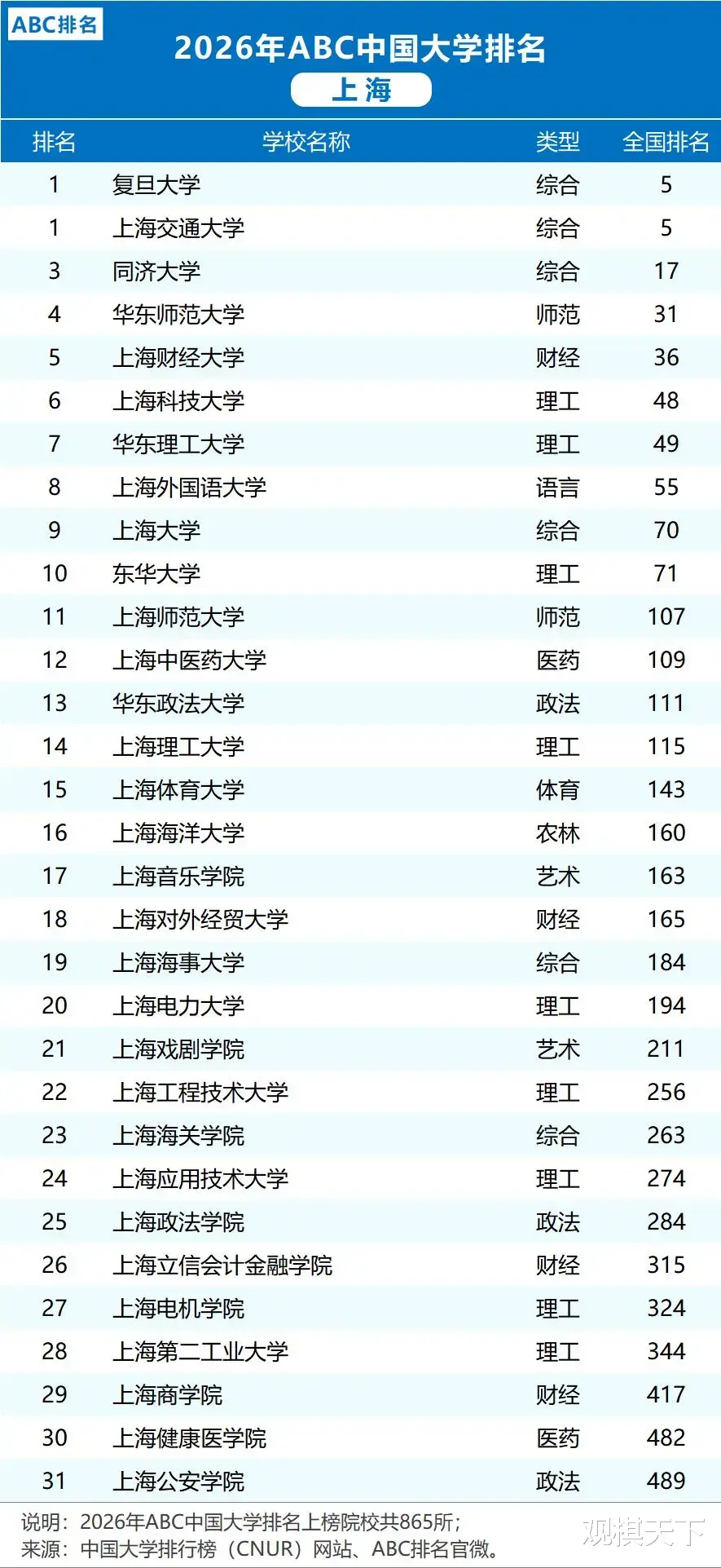 一份新的2026年ABC中国大学排名公布了, 上海地区31所公办本科院校全都榜上有名, 前十名的学校无一例外地进入了全国百强, 它们全部拥有985或211以及双一流的背景, 这样的成绩单在全国范围内, 能做到的省份并不多见。