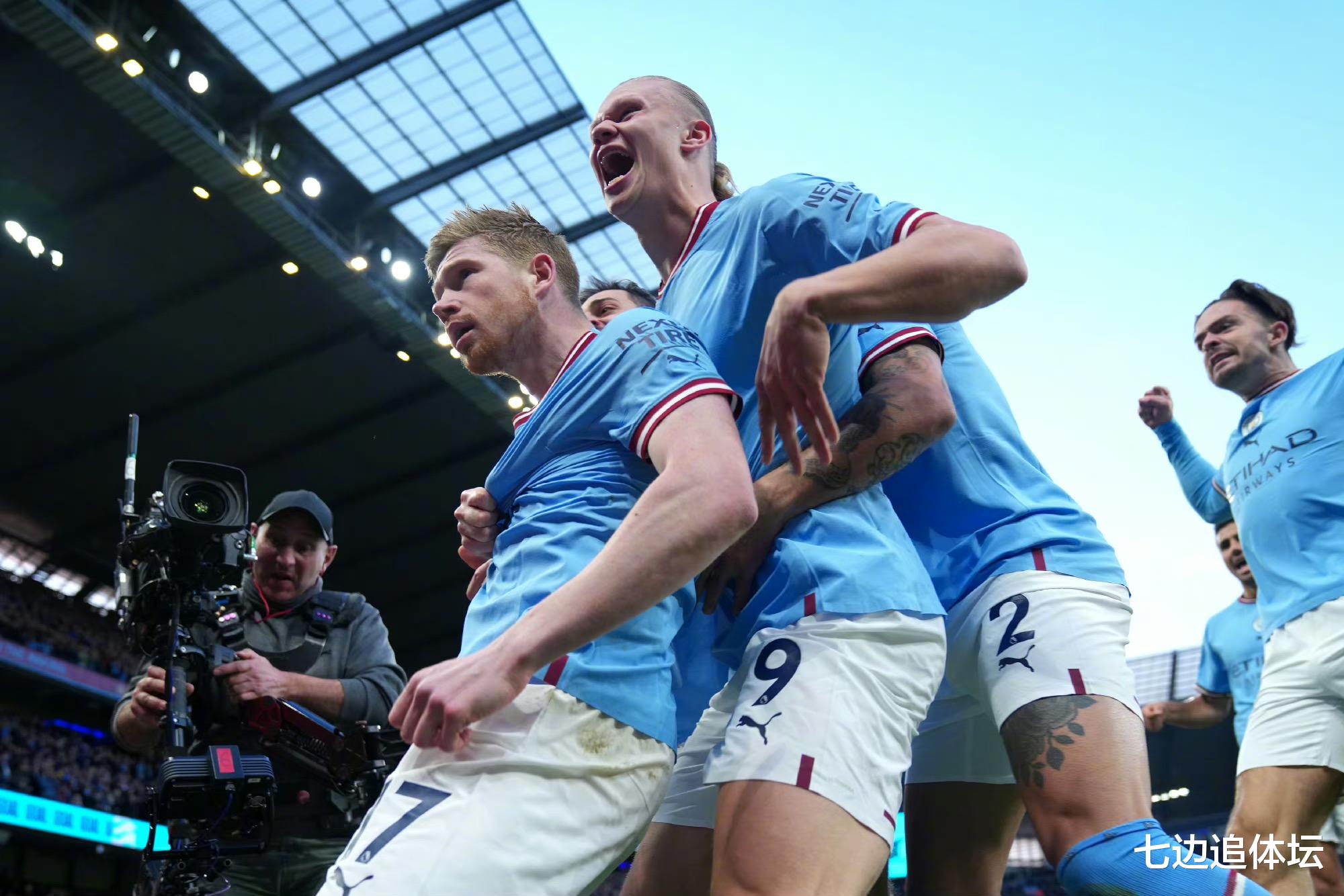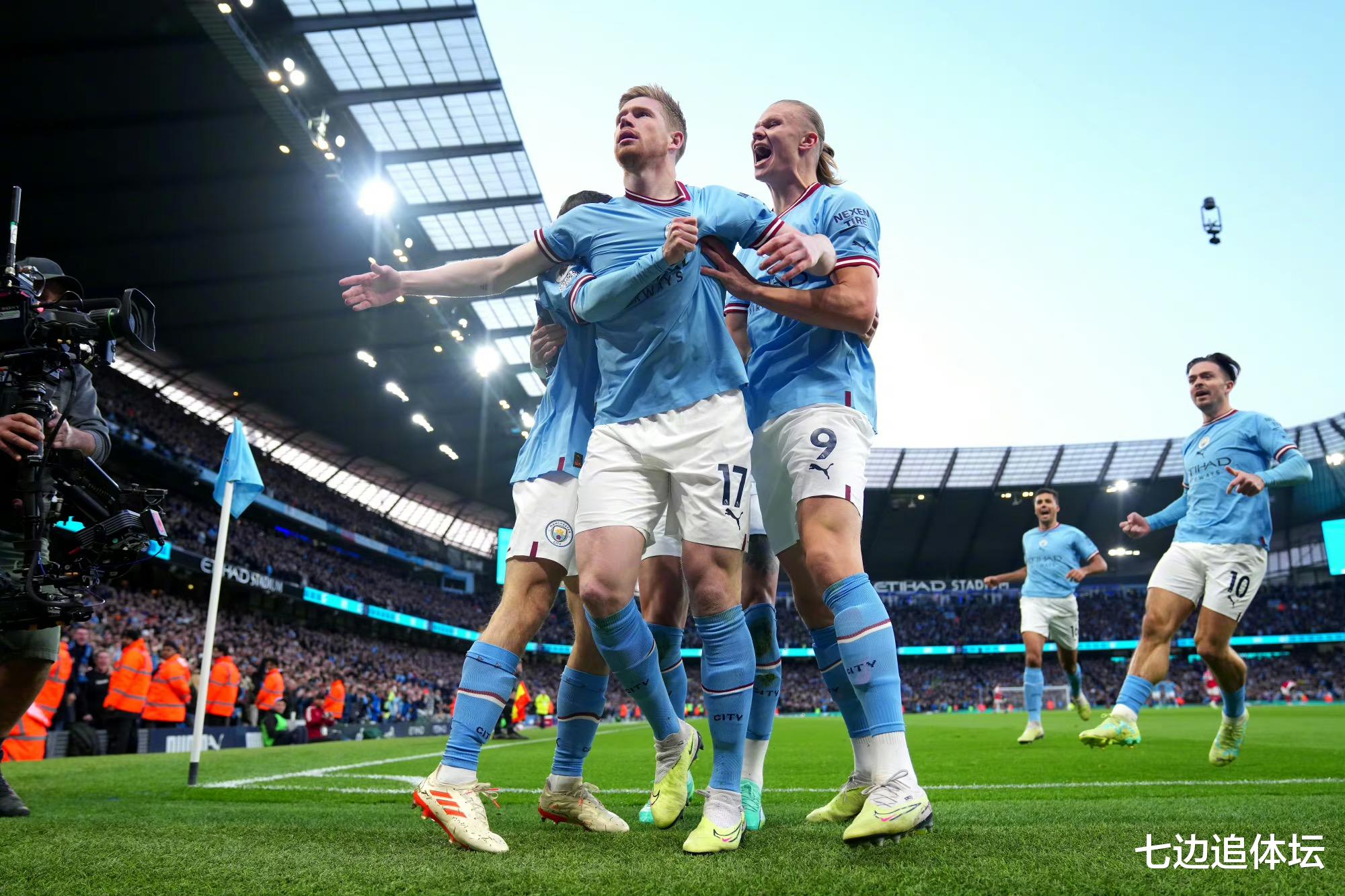开场仅7分钟,斯通斯后场长传策划进攻,哈兰德中圈倚住霍尔丁卸球转身斜塞,德布劳内插上接球带开空当甩开加布里埃尔一脚弧线贴地斩直窜网窝,1:0!曼城率先打破僵局,“布丁”连线发威,不过这次进球的是丁丁,助攻的则是魔人布欧。