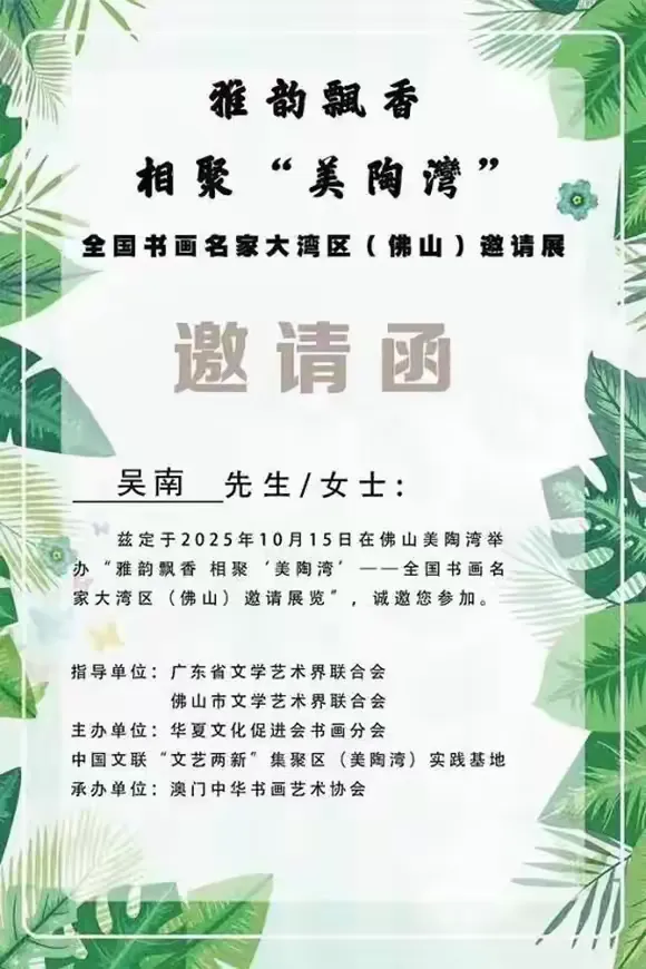 “雅韵飘香 相聚美陶湾”——全国书画名家大湾区邀请展2025年10月15日在广州佛山美陶湾文化创意产业集聚区开幕。本次展览以笔墨丹青勾勒千年陶都的文化脉动,推动文化交流与融合,展现美陶湾文化艺术创新的蓬勃生机。