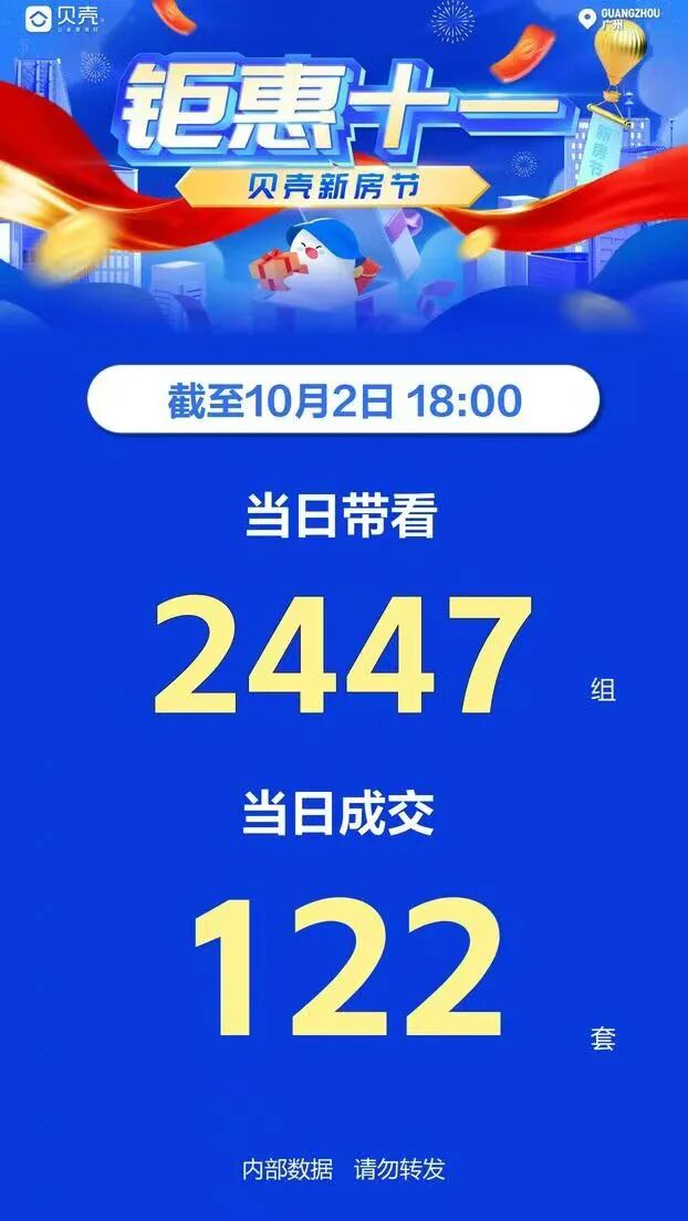 另外据悉,10月1日,贝壳单日销量近300单;而10月2日截止到18点,带看超2400组,成交122套。