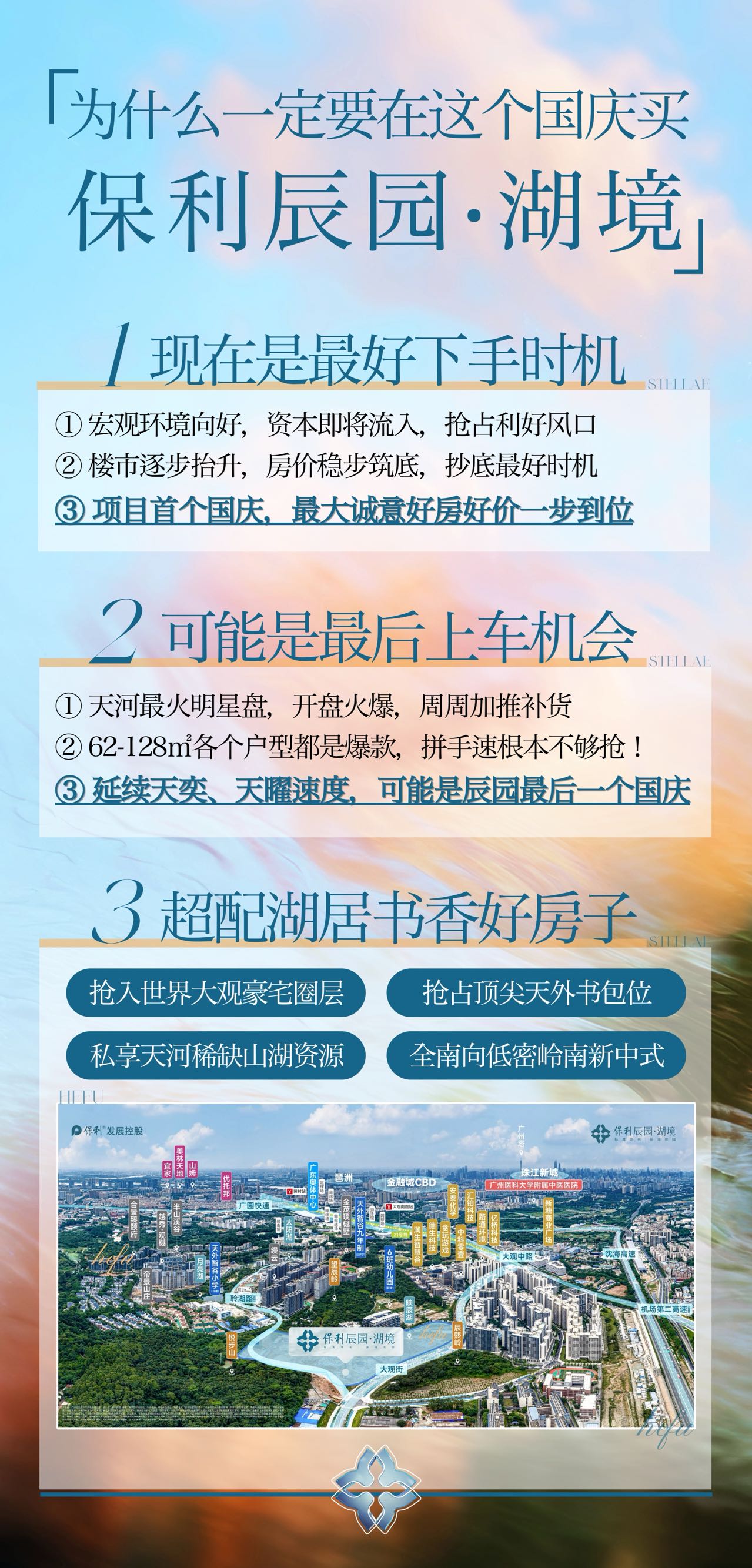2)保利辰园·湖境,在国庆加推全新2栋一线望湖约126㎡纯板式四房,及约62-88㎡全南向临湖住宅。约62㎡户型总价290万起,掀桌世界大观板块。