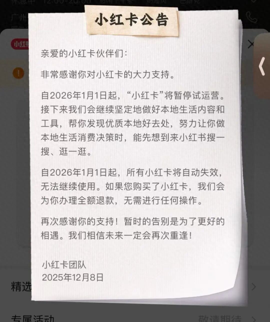 近日,小红书官方发布公告,宣布上线不足百日的本地生活会员产品“小红卡”将于2026年1月1日起暂停试运营,并启动全额退款机制。
