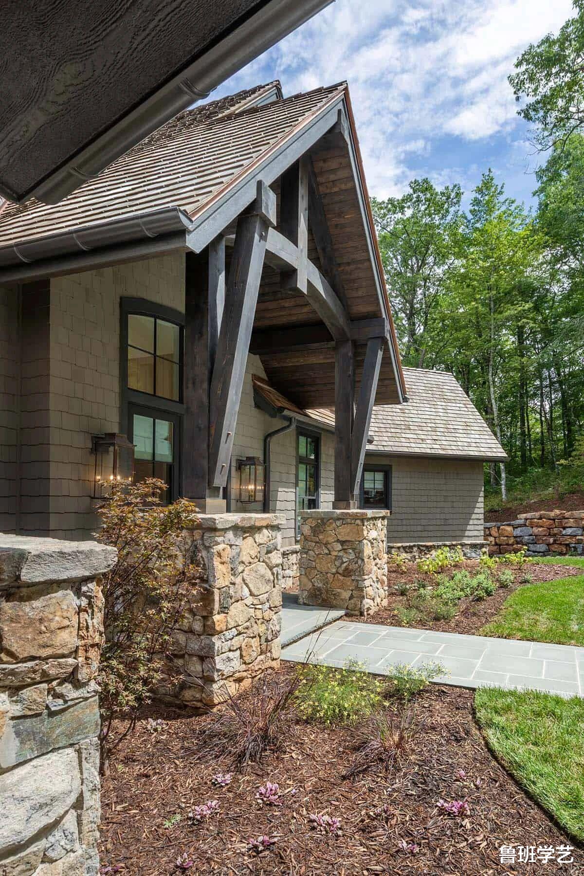 下面这套别墅完美展现出了田园别墅的特色,有仿古砖,坡屋顶,人字顶,有原木材质,复古木门,玻璃窗,还运用了天窗设计。