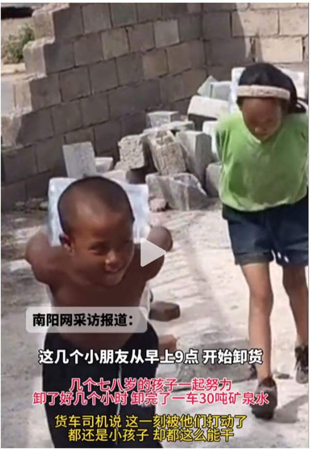 故事呢很简单,5个孩子,8小时卸了30吨矿泉水,准确说5个10岁以下的孩子。