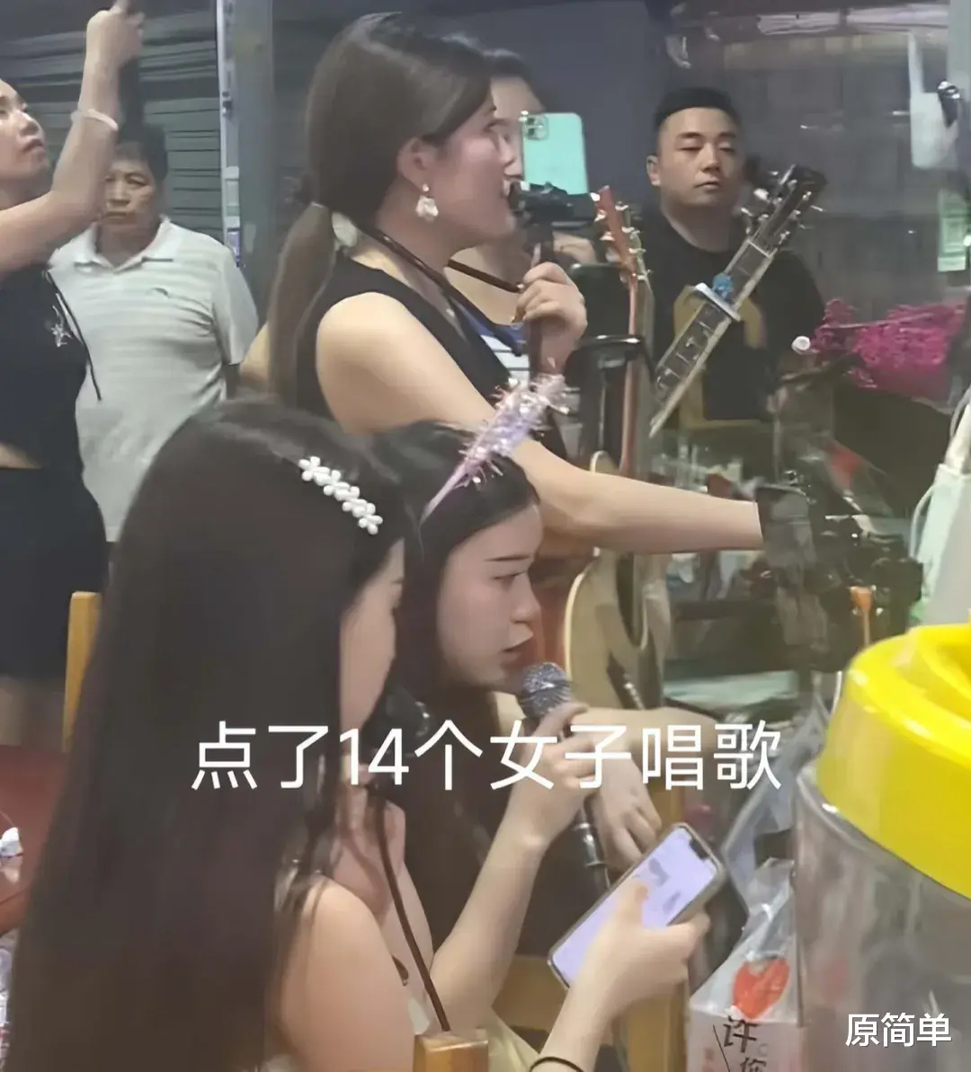 因为小吃摊有唱歌服务,一部分顾客都是被歌声吸引来的,当14个姑娘同时唱歌,再加上男子递小费的动作,乐得众人哈哈大笑。