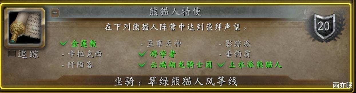 当然,目前是熊猫人之谜版本的时空漫游周,抛开坐骑不谈我们还有声望其实也是值得冲刺的,拿下9个对应声望的崇拜我们可以获得翠绿熊猫人风筝线坐骑,虽然长的不咋地好在用的时间也不用很多。
