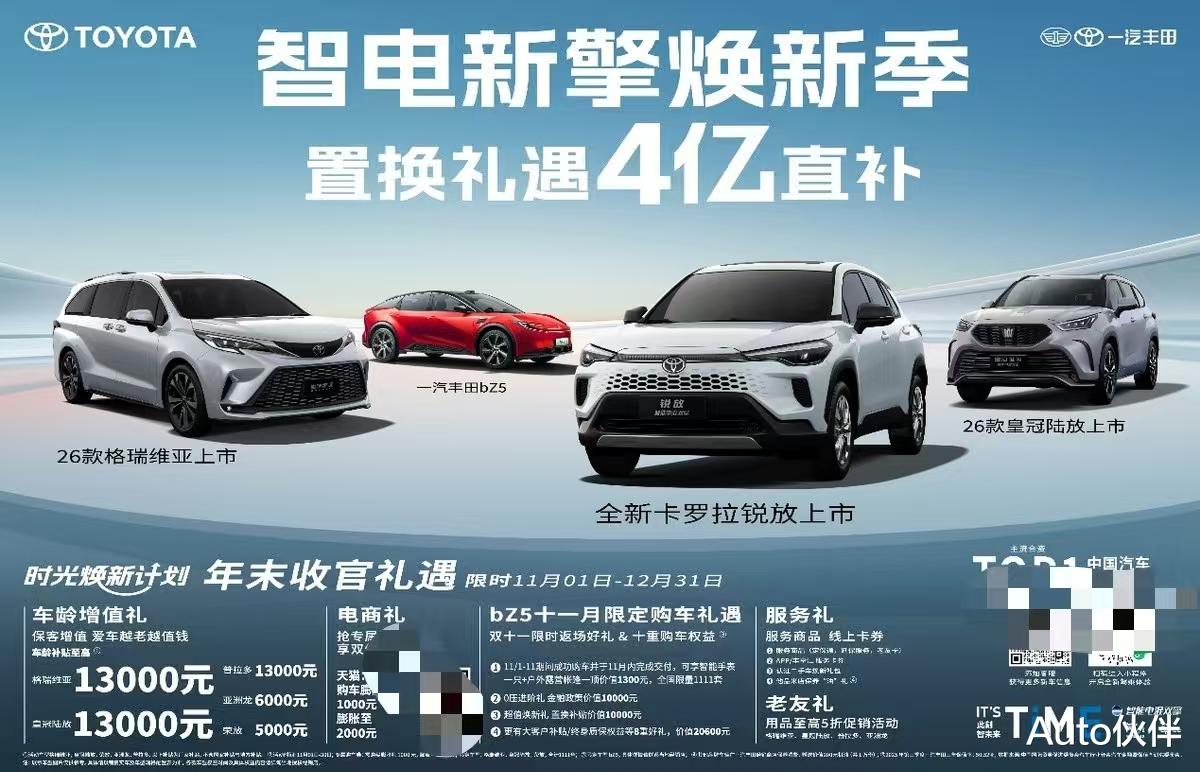 不止如此,为回馈用户厚爱,一汽丰田年末收官礼遇再升级,以4亿元厂家直补正式开启“智电新擎焕新季”。11月1日-12月31日,皇冠陆放、格瑞维亚、普拉多等重磅车型可享至高1.3万元的车龄增值礼;购全新bZ5更有限时购车福利赠送,此外“焕新季”还准备了电商礼、老友礼、服务礼等多重大礼,以极致诚意为用户创造最佳购车时机。