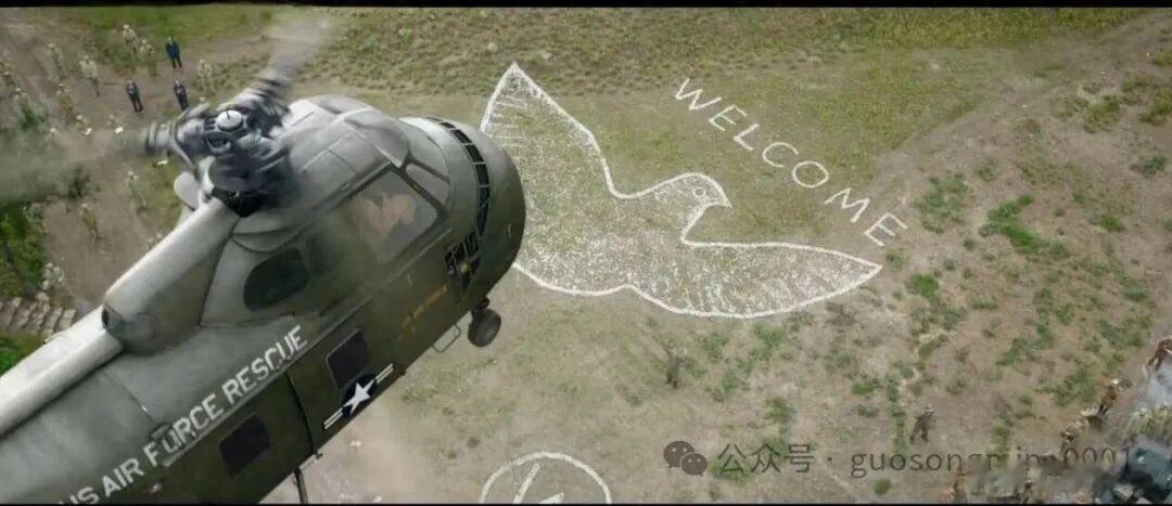 美军代表团乘直升机从天而降,故意直接降落在图案上,让螺旋桨的气浪碾碎石子造型,红色鸽眼石子滚落,如同和平鸽在“淌血”。