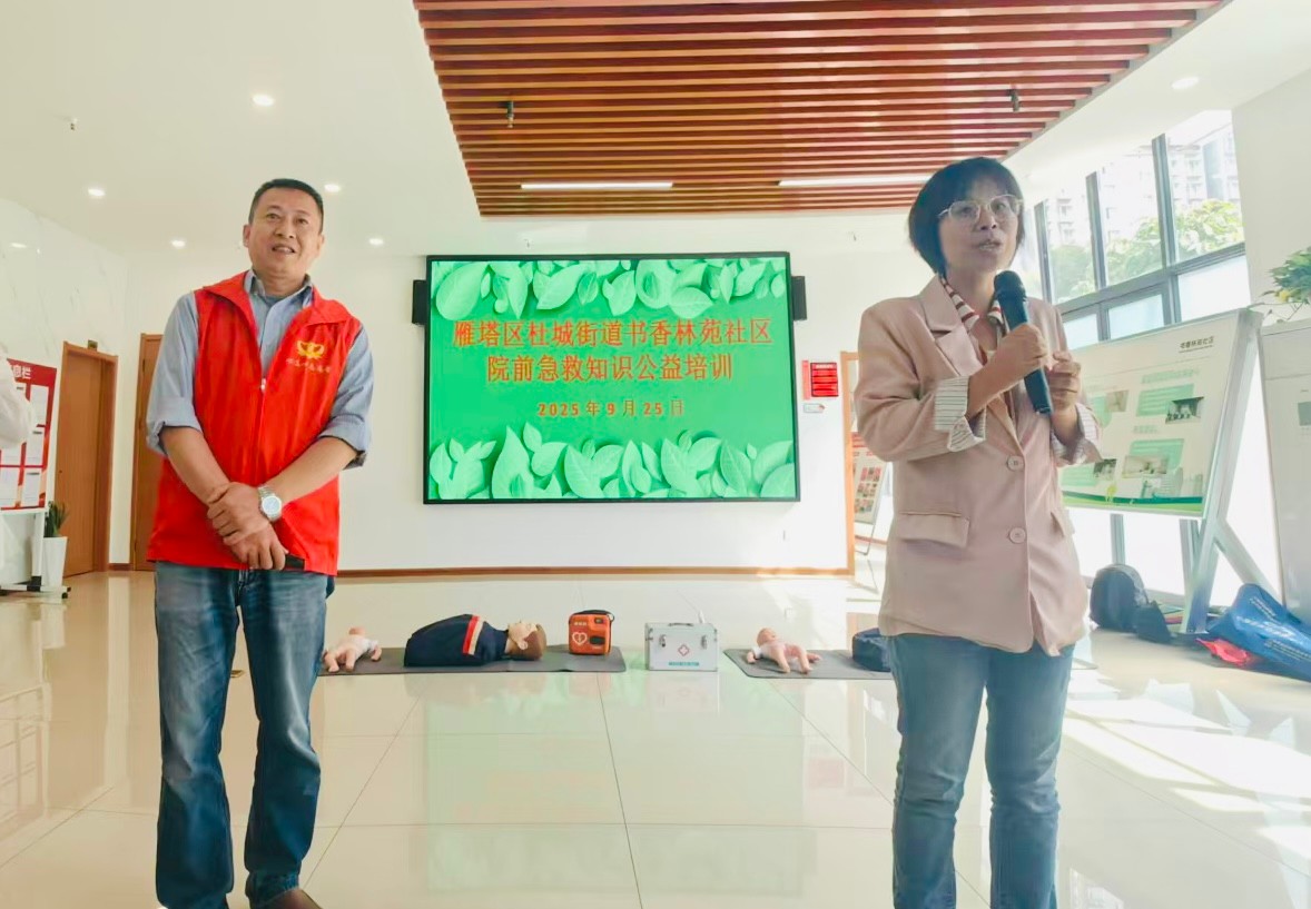 2025年9月25日下午,西安市心连心志愿者协会院前急救支队在主讲导师魏文强的带领下,走进雁塔区杜城街道书香林苑社区,开展了一场“理论+实操”相结合的急救知识公益培训活动,将守护生命的“关键技能”送到居民身边。