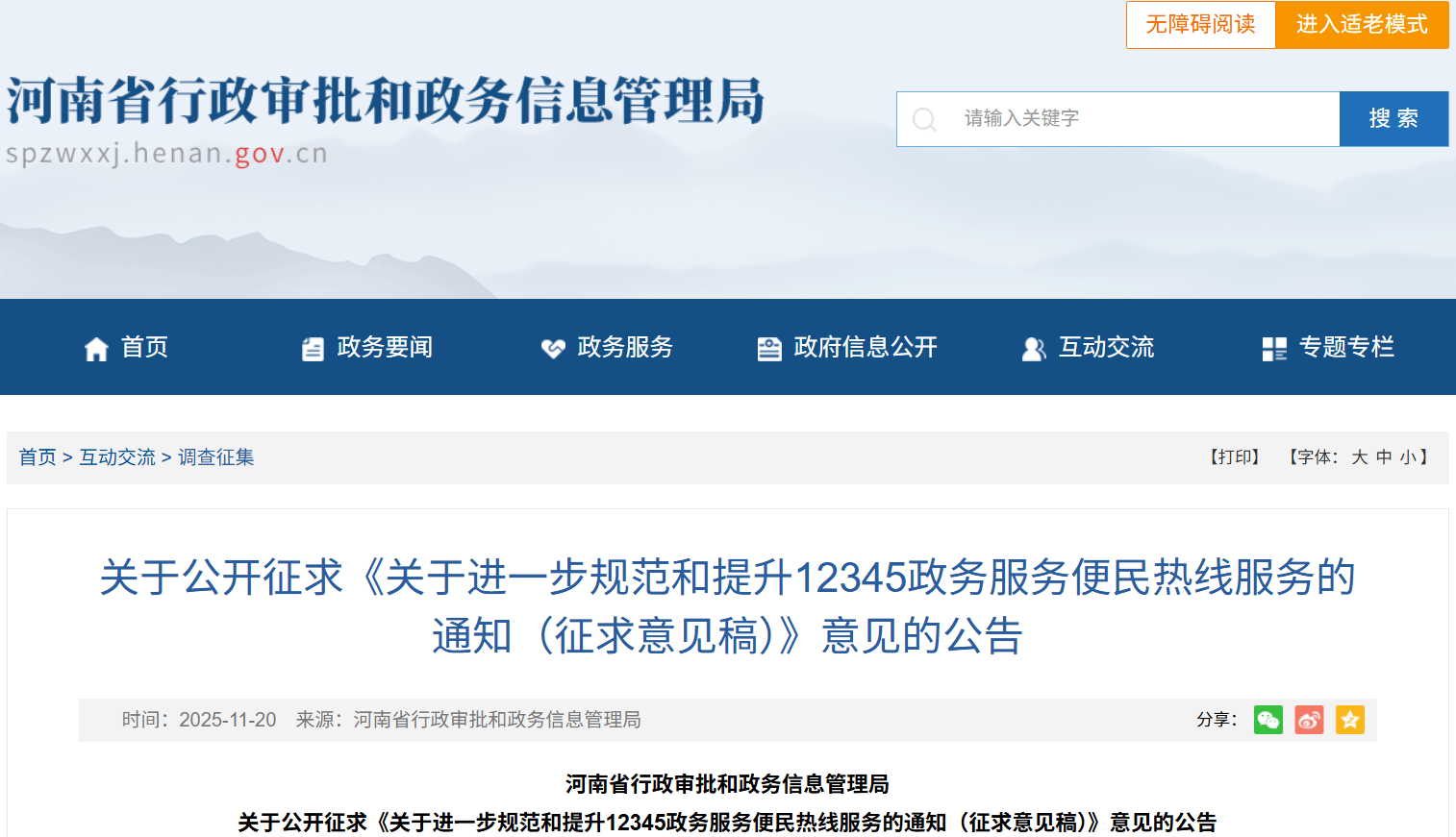 近日,河南省行政审批和政务信息管理局发布《关于进一步规范和提升12345政务服务便民热线服务的通知(征求意见稿)》(以下简称征求意见稿),面向社会公开征求意见。此次修订聚焦热线整合、诉求分类、智能服务等关键环节,旨在打造更高效、便捷、智能的民生诉求响应平台。征求意见截止时间为2025年12月4日。